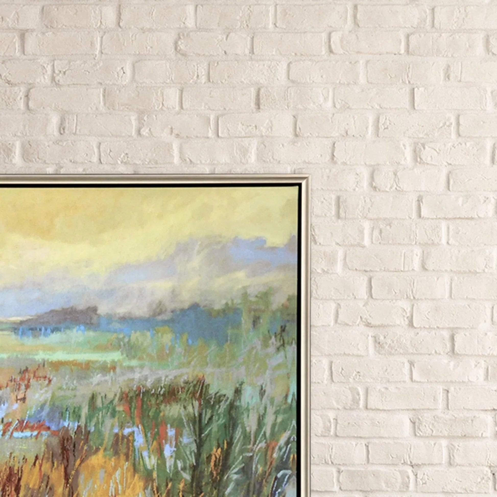 Step into a world where vibrant colors meet stunning artistry. The Marsh in May canvas captures the beauty of marshlands with a hand-applied enhanced gel finish. This piece is perfect for those who appreciate modern art with a splash of nature's brilliance. The abstract style captures the essence of marshlands, complete with reeds and sky, offering a mesmerizing view that draws the eye. Set in a warm silver floater frame with a contrasting satin black side, it adds a touch of elegance to any room.