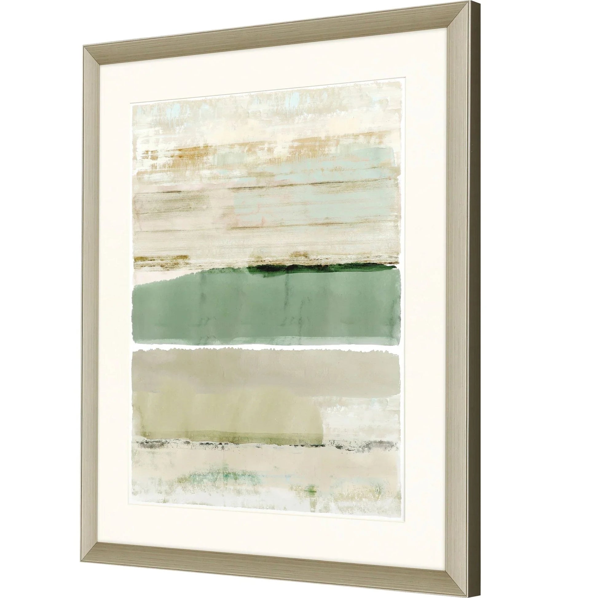 Transform any space with this beautiful piece of art where shades of green and beige converge to create a calming and sophisticated ambiance. The "Miles Away I and II Exclusive Giclee Art With Glass Front" is an exquisite piece framed in a modern shadow box style moulding with a sleek silver finish. It features an abstract painting that uses earthy tones like light green, blue, and white, enhanced by horizontal brushstrokes and a soft texture that adds depth and character to the work.