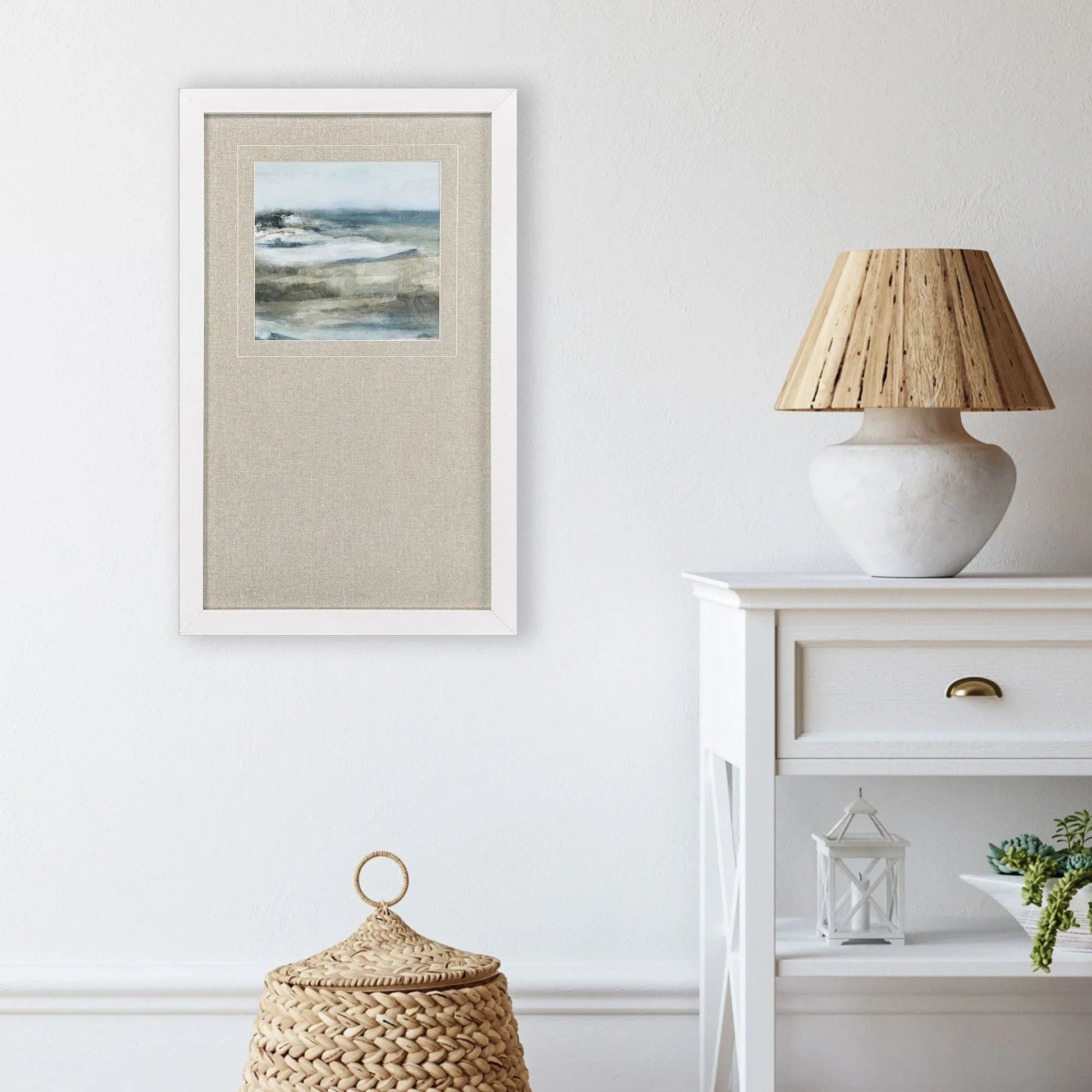 Bring the beauty of the ocean indoors with a stunning piece of art that captures the essence of the sea. This Framed Wall Art piece displays a turbulent ocean scene, showcasing soft blues, grays, and whites in a captivating abstract landscape. The artwork is elegantly presented with premium matting, featuring v-groove detailing that adds depth and dimension. Framed in a contemporary block profile with a matte white finish, this piece is designed to complement any modern decor. Its rectangular shape and sleek frame make it a versatile addition to any room, adding a touch of sophistication and serenity.