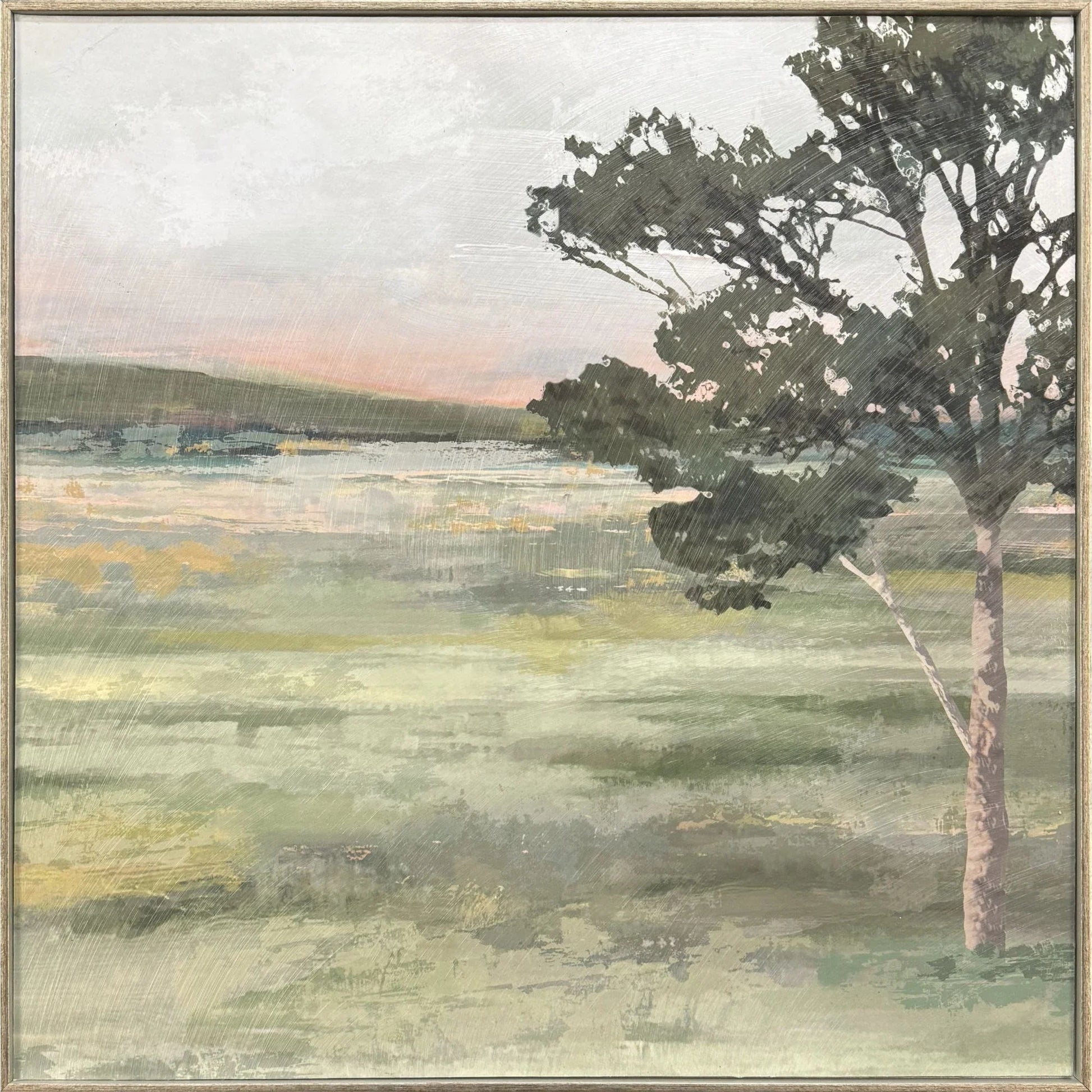 Bring the tranquility of nature into your space with this beautiful piece of artwork. The Noorong Hand Finished Dimensional Framed Wall Artwork features a serene landscape, captured with a hand-applied enhanced gel finish. The soft green and beige tones create a calming atmosphere, making it a perfect addition to any room. With abstract brushstrokes, this piece offers a unique perspective on a quiet outdoor scene, showcasing the silhouette of trees against a pastel sky.