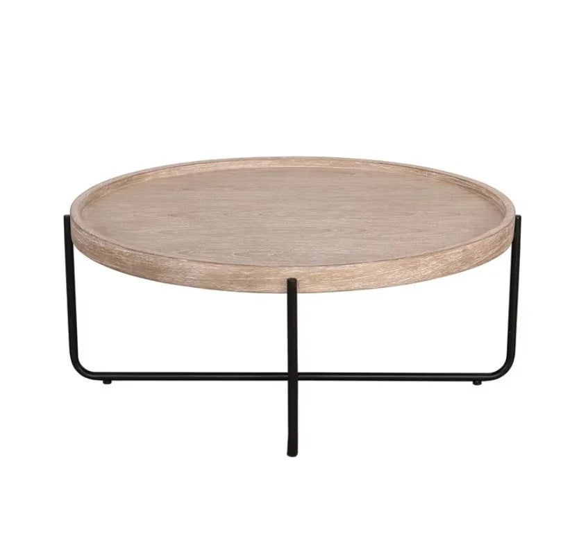 The Oliver Coffee Table is a blend of modern style and natural beauty. Crafted with sustainable Bayur wood and engineered Mindi wood, this table showcases a light brown finish that highlights its open grain, offering a warm and inviting look. The table's round surface is both spacious and practical, making it an ideal centerpiece for any living room. Its minimalist design is complemented by an X-shaped wrought iron base, adding a touch of industrial elegance to its overall appearance. This coffee table is not only a visual delight but also a functional piece of furniture.