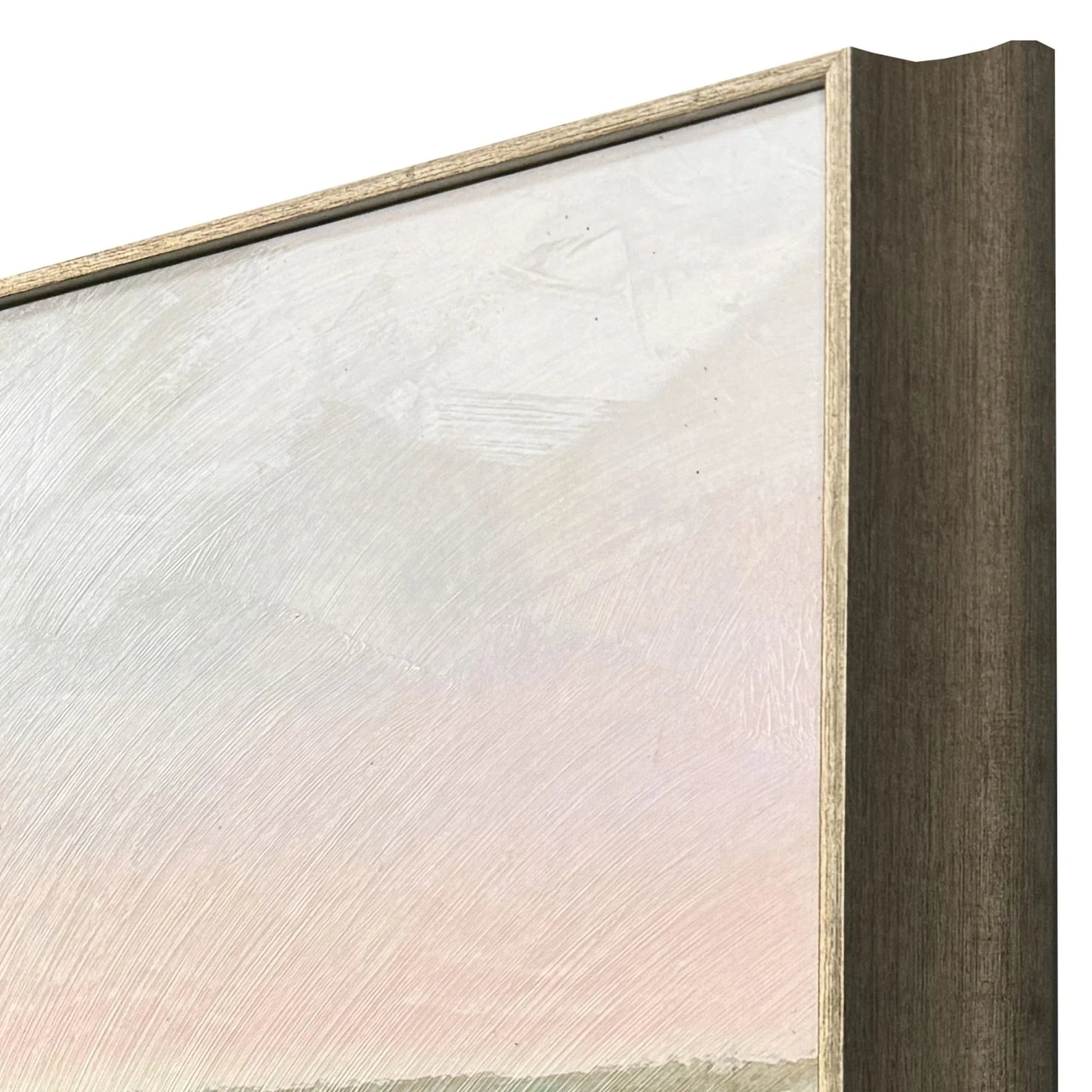 The enhanced gel finish overlay adds a unique texture to the artwork, giving it a handcrafted feel. This process highlights the subtle details in the landscape, allowing the brushwork to stand out and provide depth to the scene. The dimensional framing in a champagne gold finish, complemented by a dark wash, adds an element of sophistication. This frame, without glass, ensures the artwork remains the focal point while offering a contemporary look.
