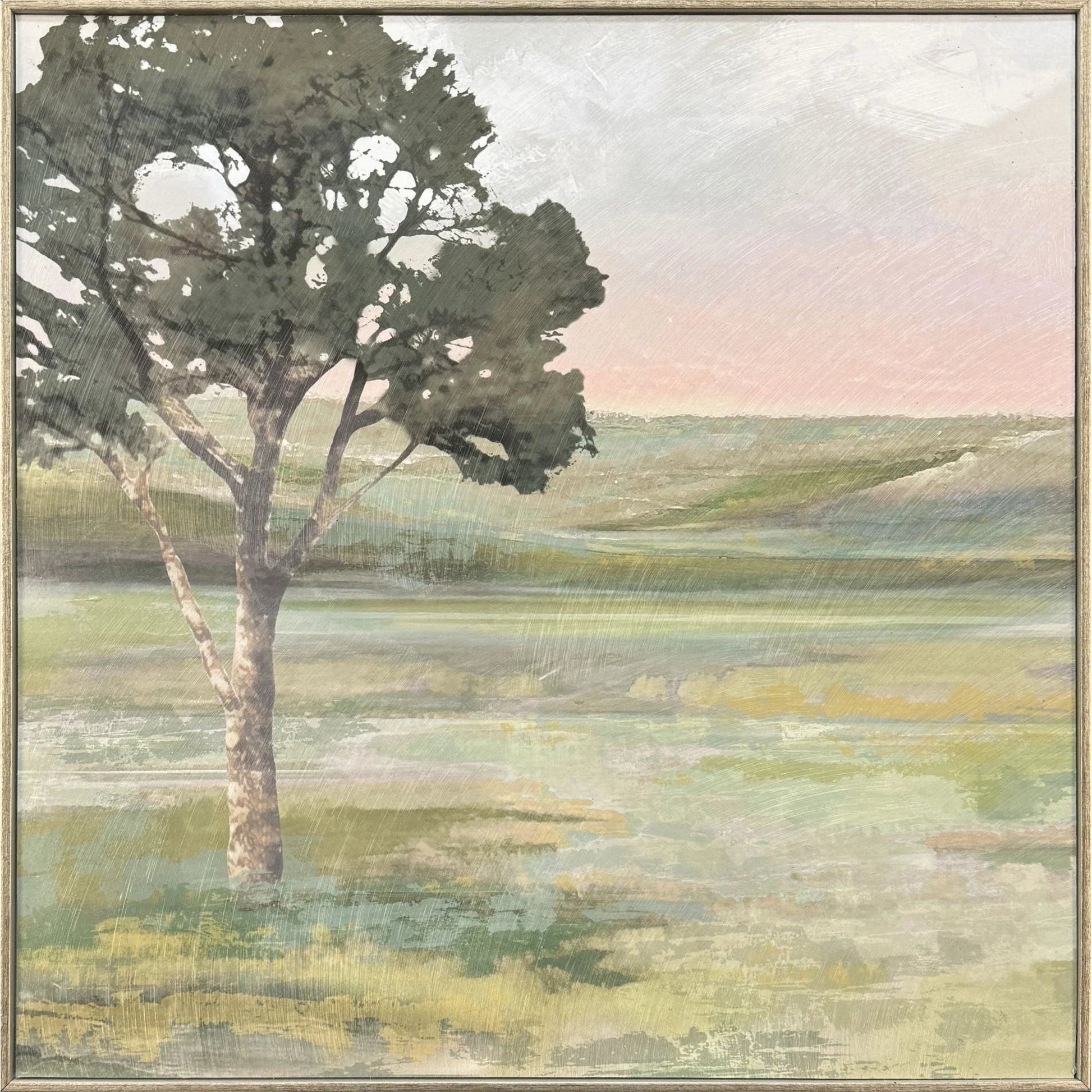 Immerse yourself in the serene beauty of the 'Omaroo Framed Wall Art With Hand Finished Gel Overlay'. This piece offers a tranquil landscape featuring a solitary tree, set against a backdrop of green fields and a pale sky at sunset. With its earthy tones and textured brushwork, this artwork creates a calming atmosphere, making it a perfect addition to any room. Its square shape and neutral colors ensure it complements a wide range of interior styles, from modern to traditional.