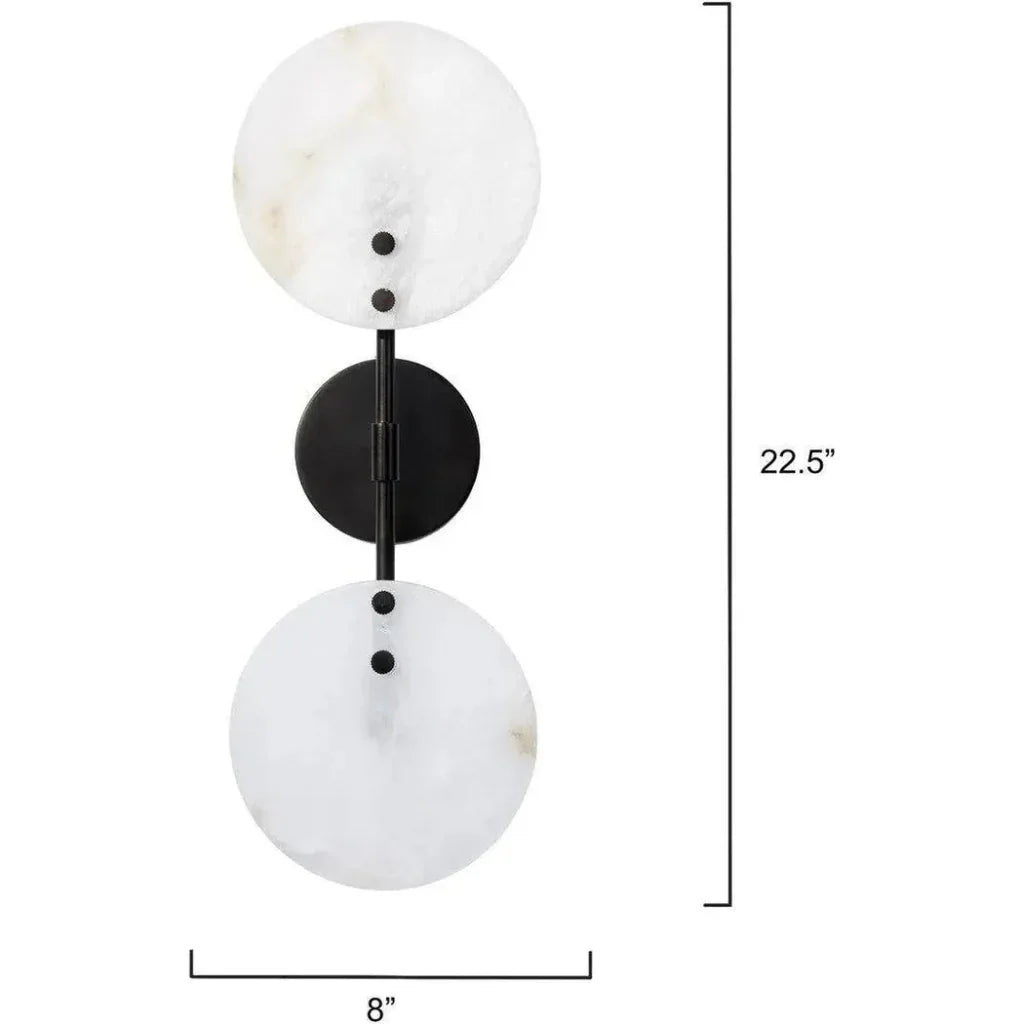 The Oracle Wall Sconce showcases hand-carved alabaster discs that orbit a brass or bronze backplate, inspired by mid-century futurism. Each natural stone disc softly diffuses light, revealing unique veining and organic details when illuminated. No two pieces are alike, giving every sconce a distinctive character. Perfect for framing mirrors vertically or arranged horizontally in hallways, this design adds sophistication and modern appeal. Available in Antique Brass with a bronze backplate or Oiled Bronze with an antique brass backplate, the Oracle Wall Sconce enhances interiors with both beauty and functionality.