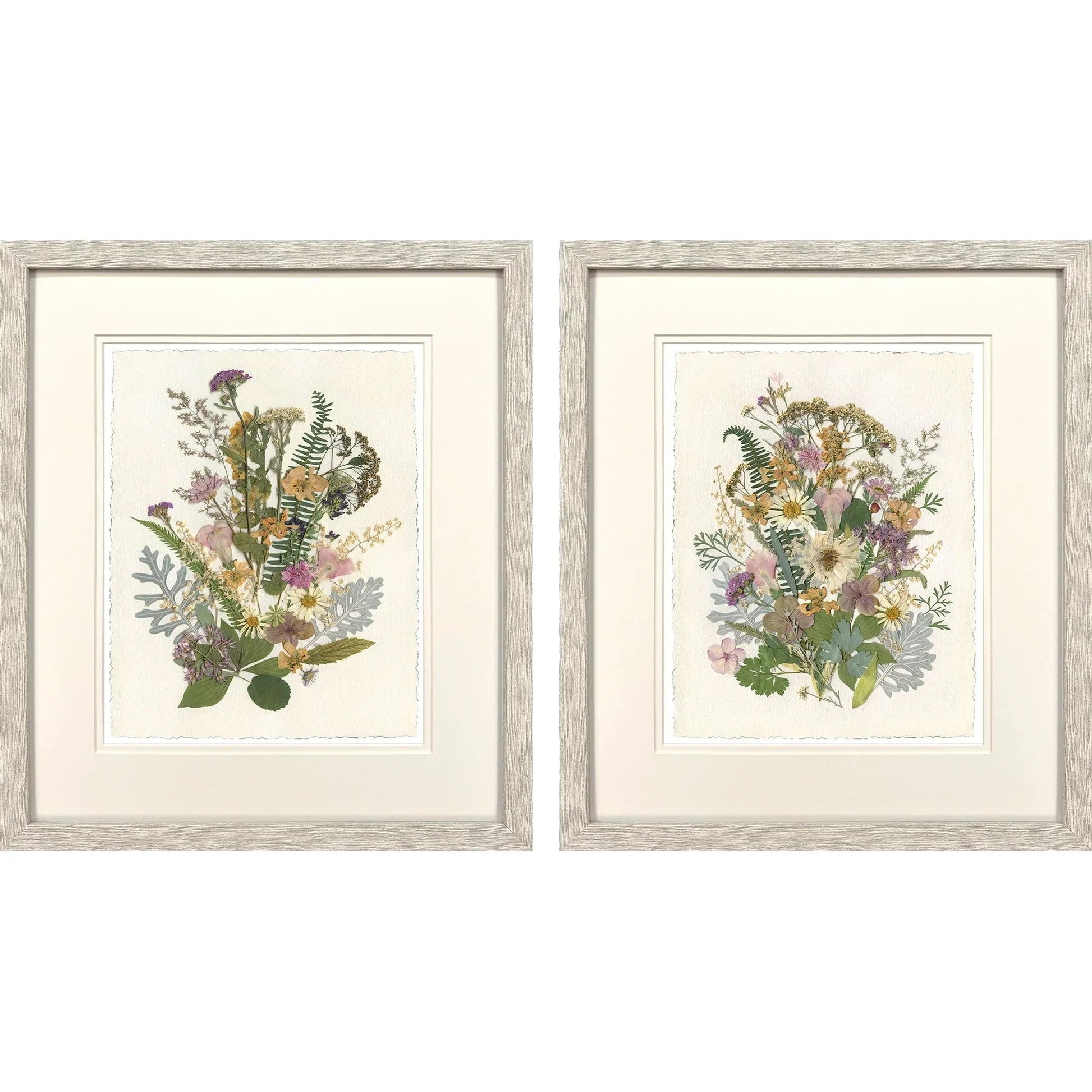 The Organica Bouquet S/2 Elegant Glass Framed Floral Set brings a touch of nature’s beauty into your home. This set of two Framed Wall Artworks features pressed flower bouquets in vibrant hues of green, pink, and purple. These floral elements are elegantly arranged on a light background, creating a stunning display that captures the essence of botanical beauty. The design is double matted in white, enhancing the colors and adding depth to each piece. The distressed whitewash finish on the frame adds a rustic charm, making it perfect for casual decor styles.