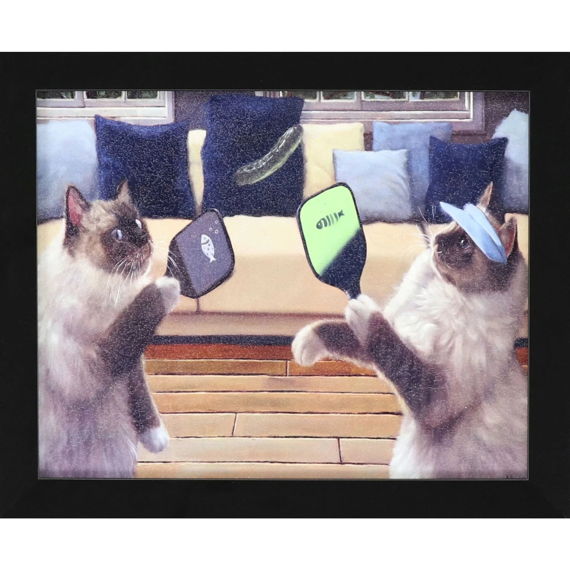Add a playful touch to your space with this Framed Wall Art piece that brings humor and charm to any room. The artwork features two quirky cats engaged in a delightful game, complete with paddles and feathered fun. Their colorful visors add a splash of whimsy, set against a cozy background of a beige couch with vibrant blue and yellow cushions. The vibrant red color of the print effortlessly brightens up any wall, making it a delightful conversation starter.