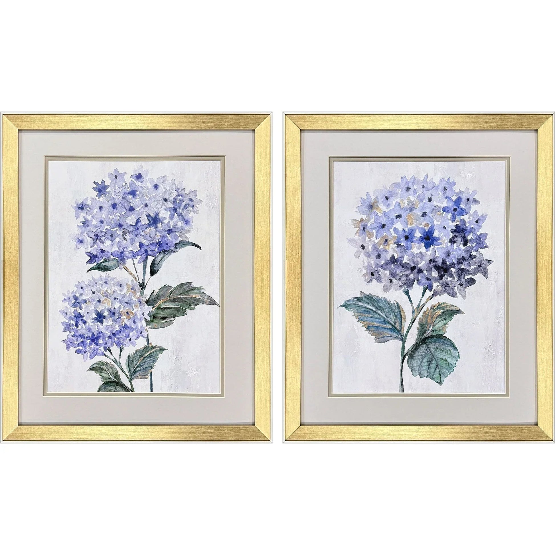 Enhance your living space with this elegant set of two framed hydrangea art pieces. Perfectly sized for any room, these prints are an ideal addition to your home decor. Each artwork features beautiful hydrangeas in rich purple and blue hues, accented by lush green leaves, creating a calming and inviting atmosphere. The images are double matted with a neutral top mat and pewter, adding depth and sophistication to the presentation. The modern gold finish moulding with champagne side and lip adds a touch of luxury, making them suitable for both traditional and contemporary settings.