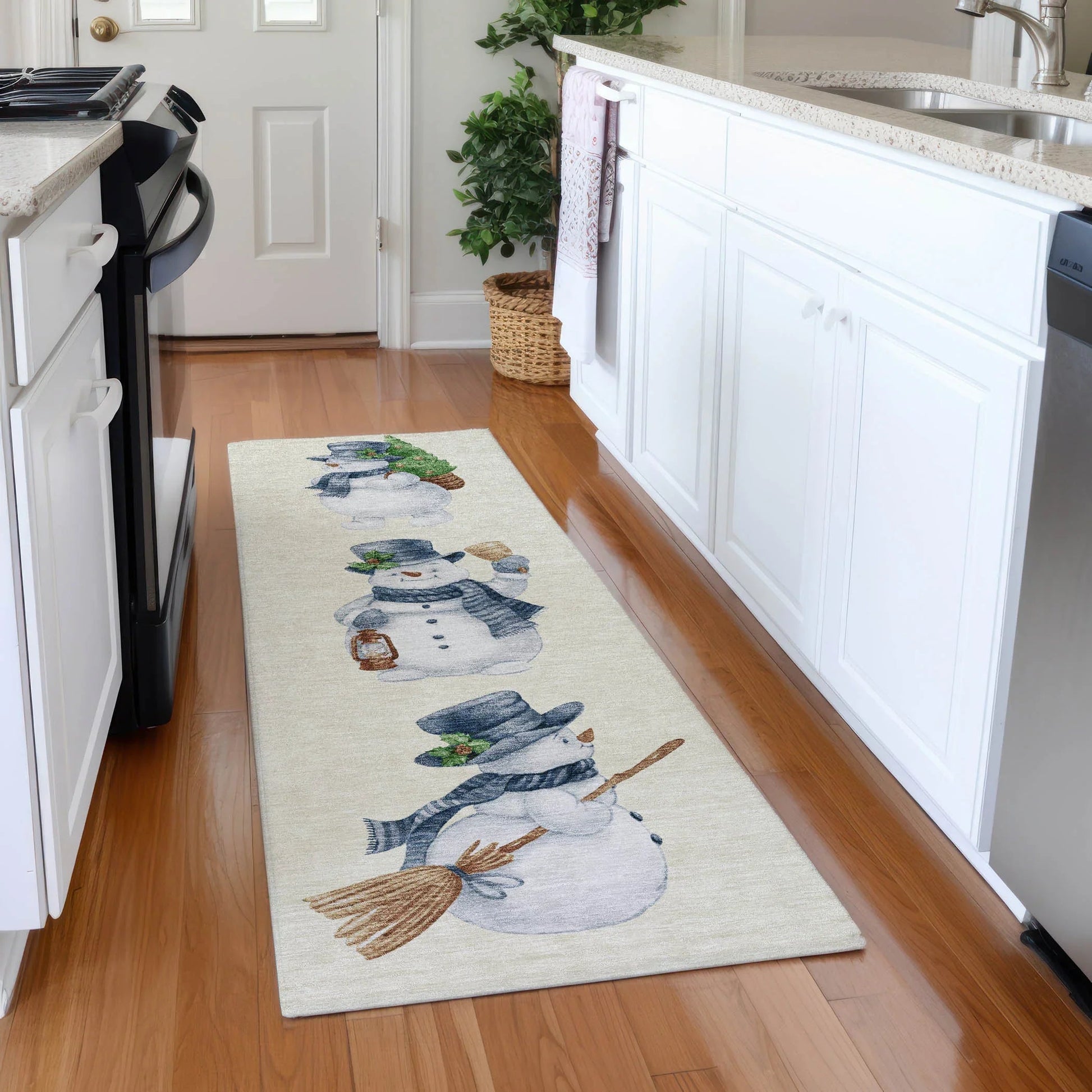The Raeanor Ivory Washable Rug With Non-Skid Backing brings a touch of whimsy to any space with its delightful snowmen design. These cheerful snowmen add a festive feel, making it a charming centerpiece for your home during the holiday season. The rug's transitional style ensures it fits well in both modern and traditional settings. Crafted for versatility, this rug is perfect for both indoor and outdoor use, featuring UV stabilization to maintain its vibrancy. Its ultra-thin design ensures easy cleaning, making it a practical choice for busy households with children and pets.