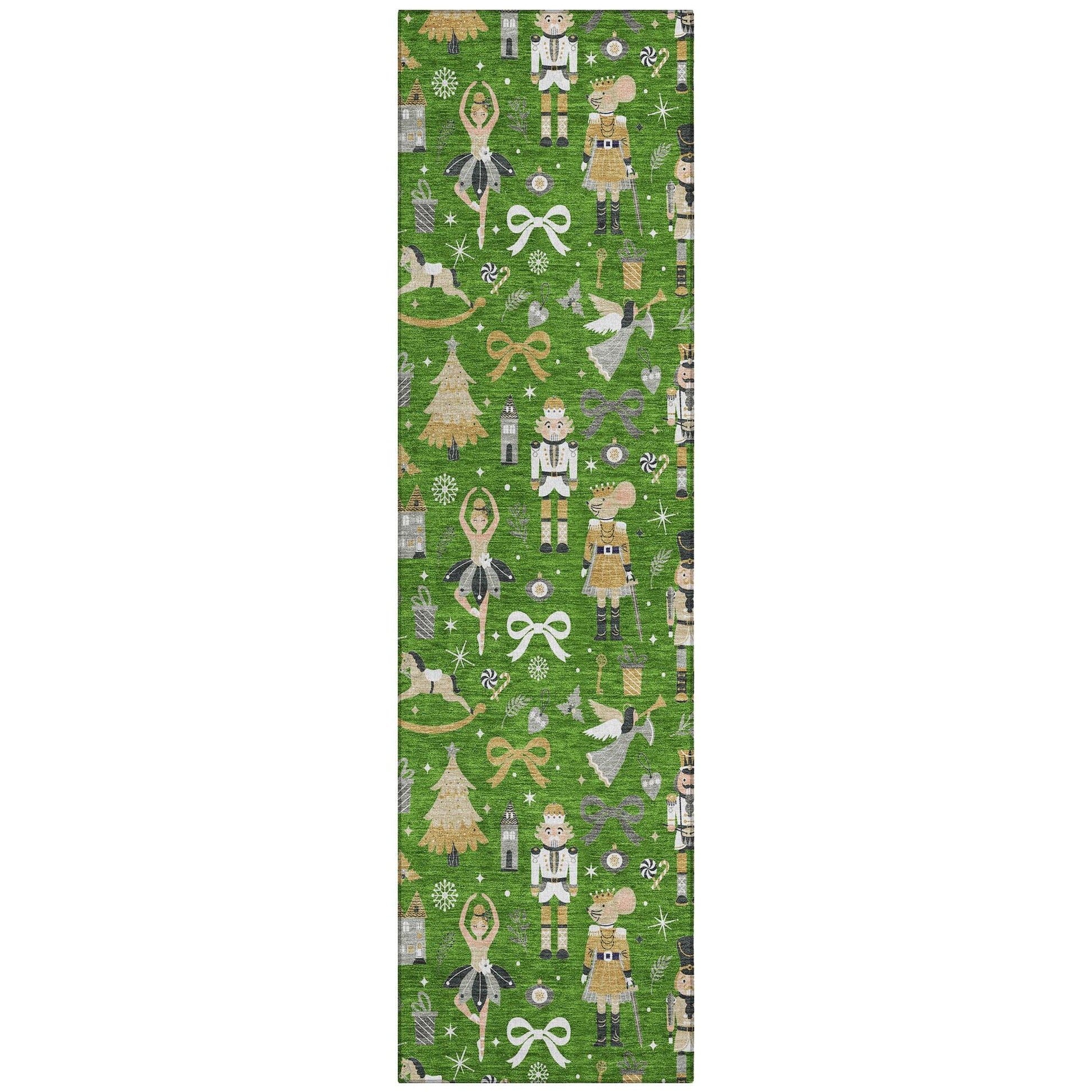 The Raeara Green Washable Rug is a delightful addition to any space, bringing festive cheer with its charming design. Featuring playful nutcrackers, trees, bows, rocking horses, and presents, this rug is perfect for the holiday season. Mice and angels add a whimsical touch, creating a joyous atmosphere. Its transitional style ensures it blends seamlessly with both classic and modern decor, making it a versatile choice for any home. Designed for both indoor and outdoor use, this rug is UV-stabilized, maintaining its vibrant colors even in the sun.