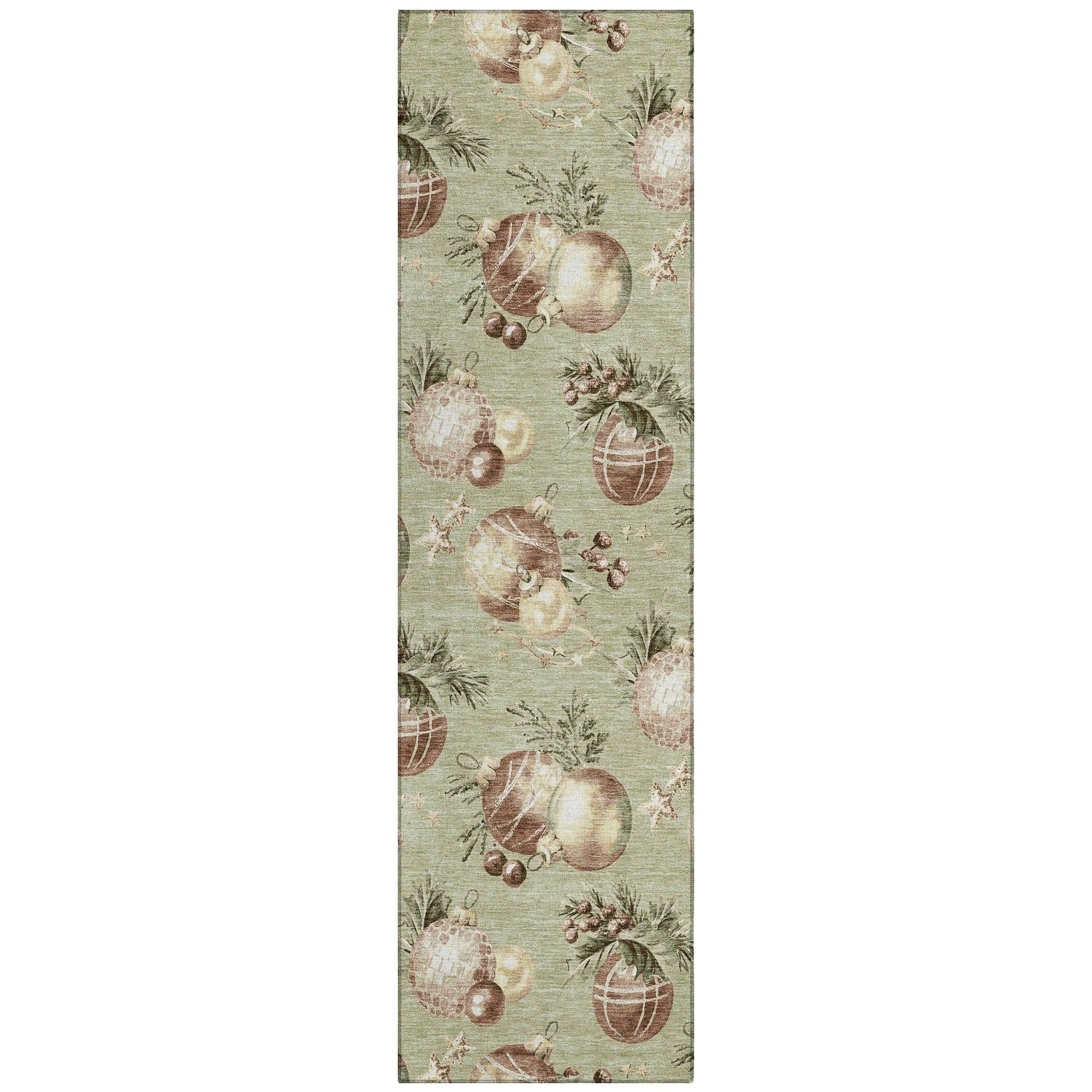 The Raearis Aloe Washable Indoor-Outdoor Rug is designed to bring a touch of festive cheer to any space. With its delightful pattern of gold ornaments, holly, and stars, this rug adds a cozy and inviting feel to your home. The gold tones lend a luxurious sparkle, making it perfect for holiday gatherings. Whether your style is modern or classic, this transitional design complements any decor. Its ultra-thin construction ensures easy placement in various areas, and its UV-stabilized material makes it suitable for both indoor and outdoor use. The aloe color adds a subtle touch of nature, enhancing the overall aesthetic.