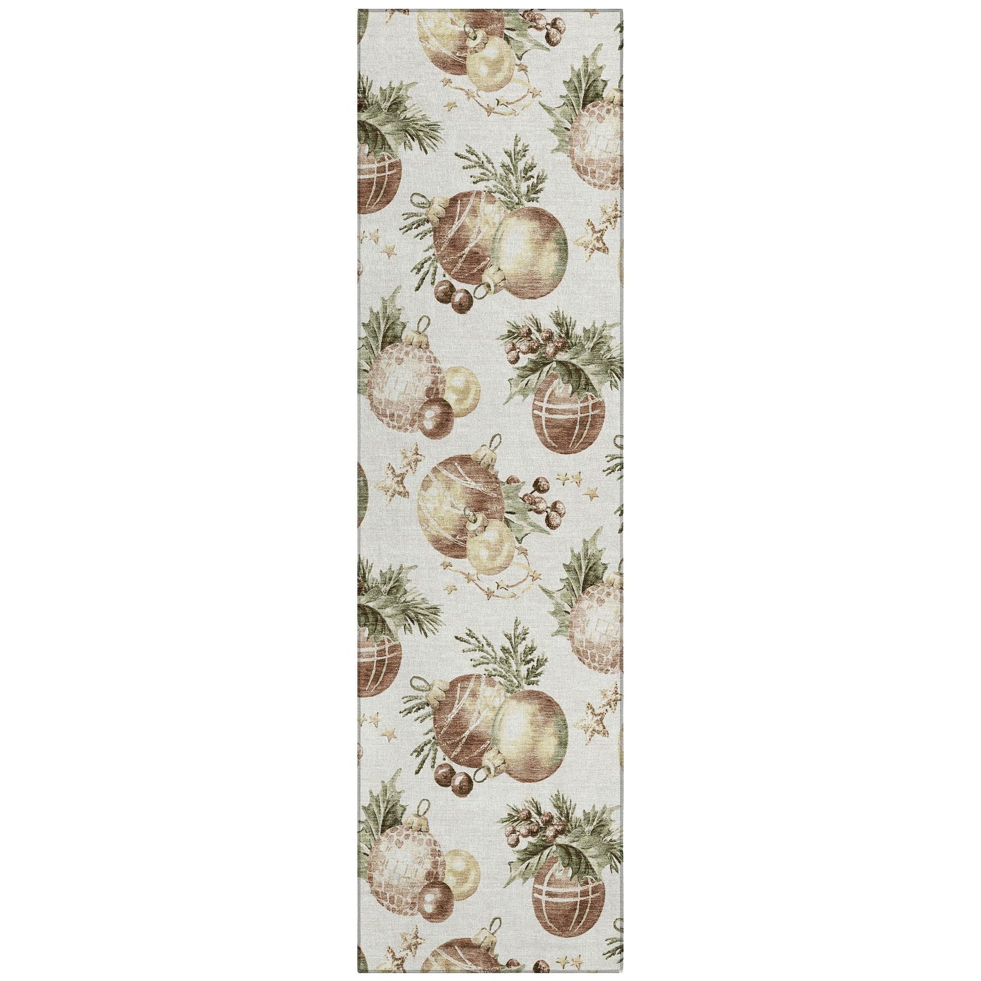 The Raearis Ivory Washable Indoor-Outdoor Rug is adorned with a beautiful blend of gold ornaments, holly, and stars, creating a warm holiday ambiance. The gold accents add a touch of luxury, while the holly and stars evoke a cozy, festive atmosphere, making it an ideal choice for Christmas décor. This rug's transitional style ensures it fits seamlessly into both modern and classic settings, making it a versatile addition to any home.