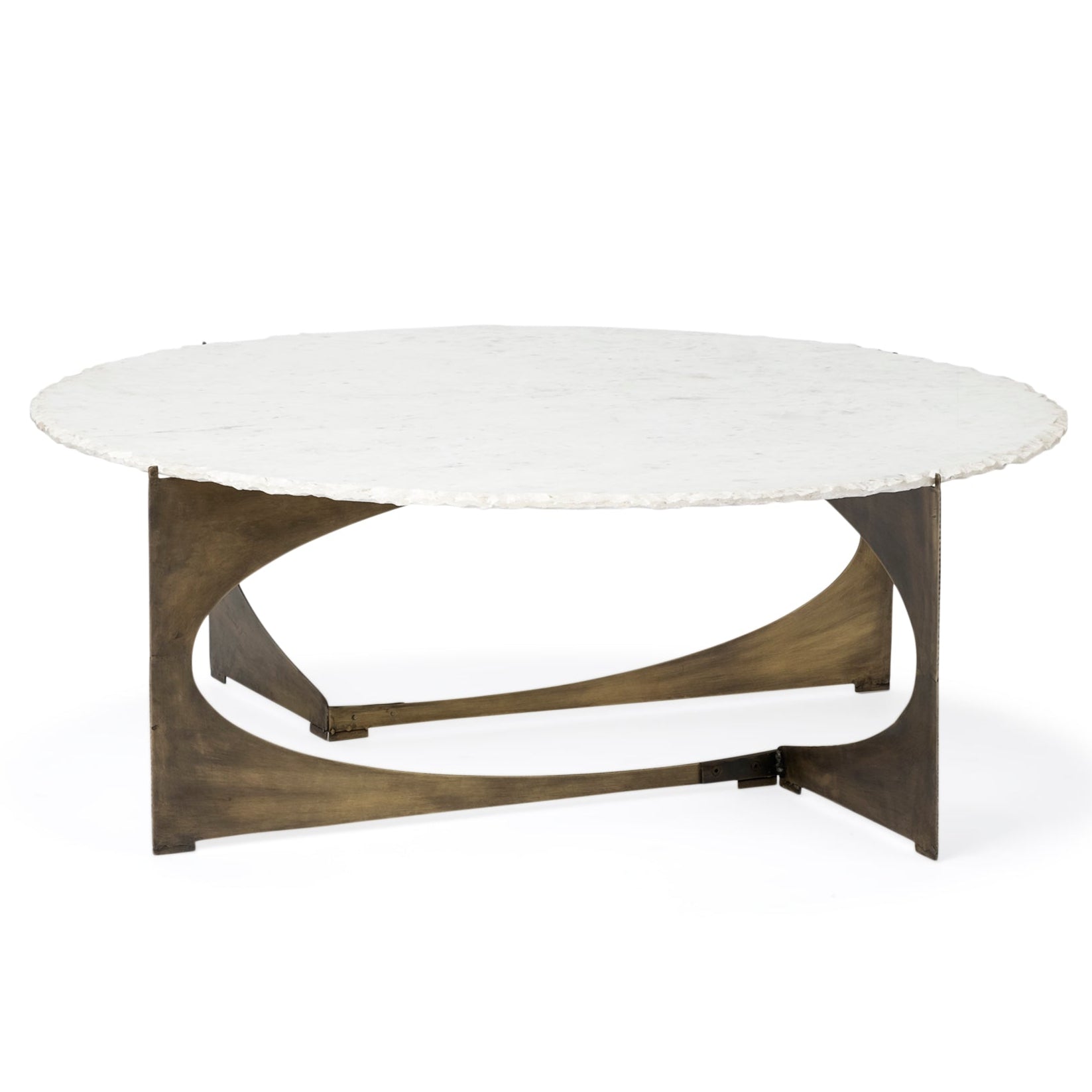 - This coffee table's marble top is supported by angular iron legs with crescent-shape cutaways that create interesting side profiles.