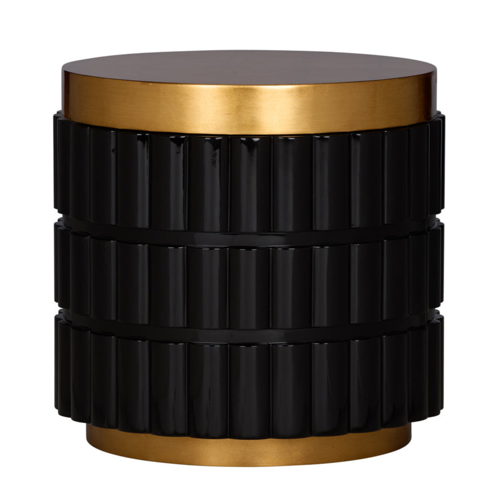 The Ridgeworth Table brings bold design and practicality together with its modern look and smart features. It stands out with a glossy black ribbed body, paired with a stunning gold leaf top and base, giving any room a touch of elegance. But there's more to this table than its sleek appearance. It opens up to reveal hidden interior shelving, offering a clever storage solution for your living space. Perfect for those who appreciate style and function, this table is a fabulous addition to any home. Its sculptural design not only adds visual interest but also serves as a practical piece for everyday use.