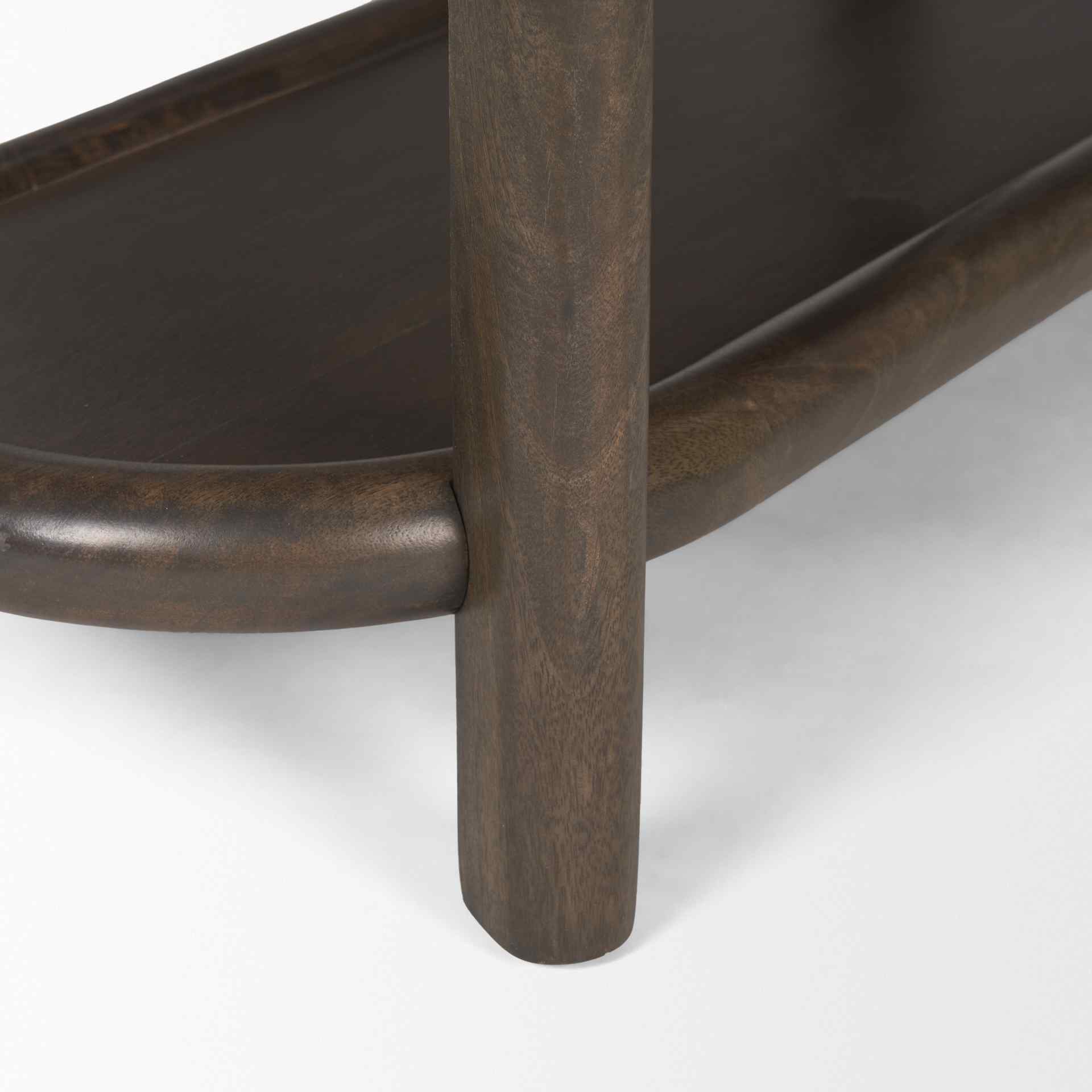 The Romi Console Table offers a blend of style and functionality with its classic design. Crafted from solid mango wood, it features a rich, dark brown finish that enhances its elegant appearance. The oval tabletop is surrounded by a curved rim, adding a touch of sophistication to its design. With three spacious tiers, this console table provides ample room for displaying your favorite decor items. Its rounded legs add a subtle refinement, making it a versatile piece suitable for various interior styles.