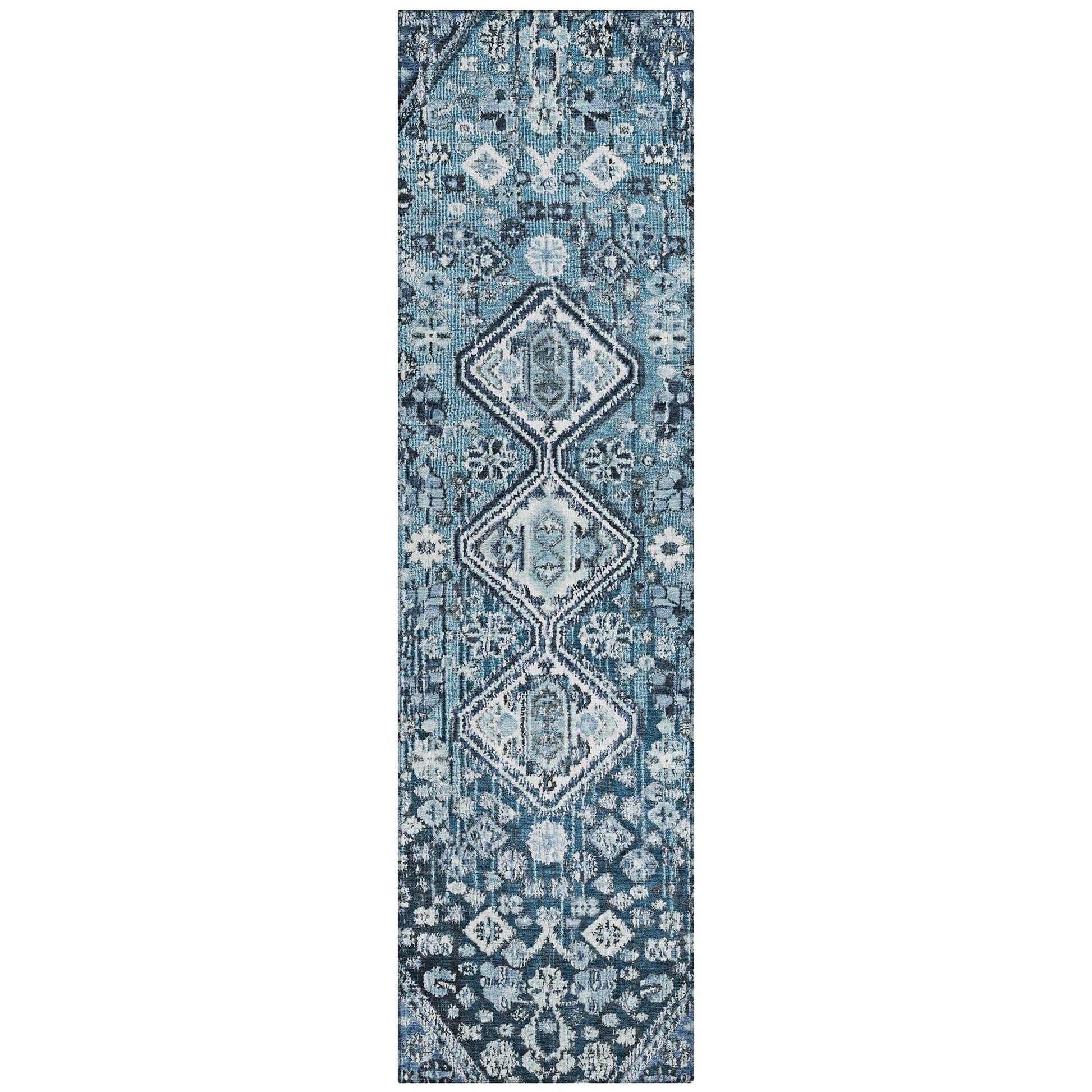 Step into style with the Saelain Blue Washable Rug. This rug is designed with three diamond medallions, interwoven with intricate motifs, all set in a striking Aztec pattern. Its vibrant blue color not only brings a touch of elegance to any space but also blends effortlessly with various decor styles. Whether placed indoors or outdoors, its UV stabilization ensures that it maintains its color and beauty even in the sunniest spots. The ultra-thin profile allows it to fit seamlessly into any setting, making it a versatile choice for any room or outdoor space.