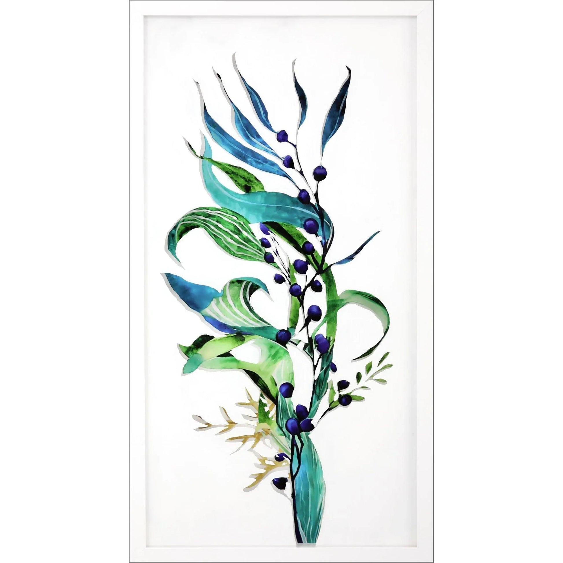 Bring the beauty of the ocean into your space with this exclusive mixed media shadow box art. Featuring hand-painted acrylic overlays, this piece combines vibrant leaves and blue and green hues with purple berry accents on a clean white background. The abstract style of the artwork adds a touch of modern elegance to any room, while the coastal theme creates a calming atmosphere. The rectangular white frame is crafted from lacquered wood, adding a sophisticated touch to the overall design.