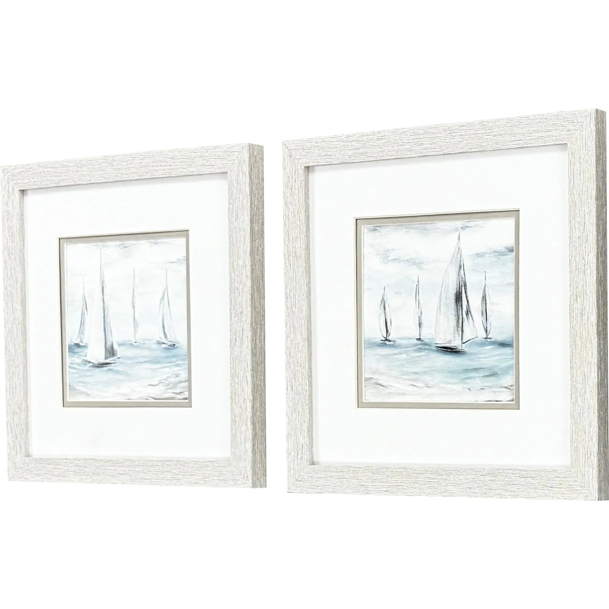 Bring the calming essence of the ocean into your home with the Soft Summer Wind S/2 Framed Coastal Wall Art Set. This set features sailboats gracefully gliding over serene blue ocean waves, perfectly capturing a tranquil nautical theme. Each print is double matted with a pristine white top mat, enhancing the vivid blue, white, and grey tones. The art is beautifully encapsulated in a distressed whitewash finish frame, adding a touch of rustic charm to any room. Its coastal style makes it an ideal addition for those looking to create a serene atmosphere in their living space.