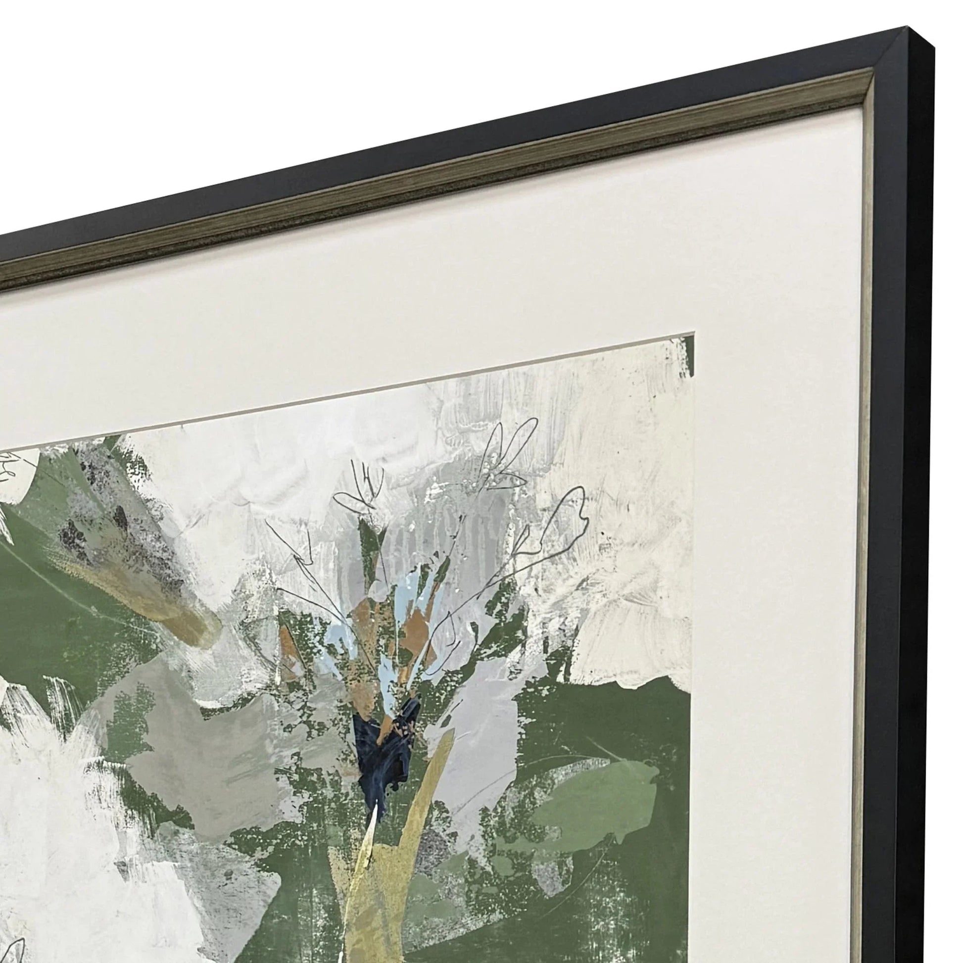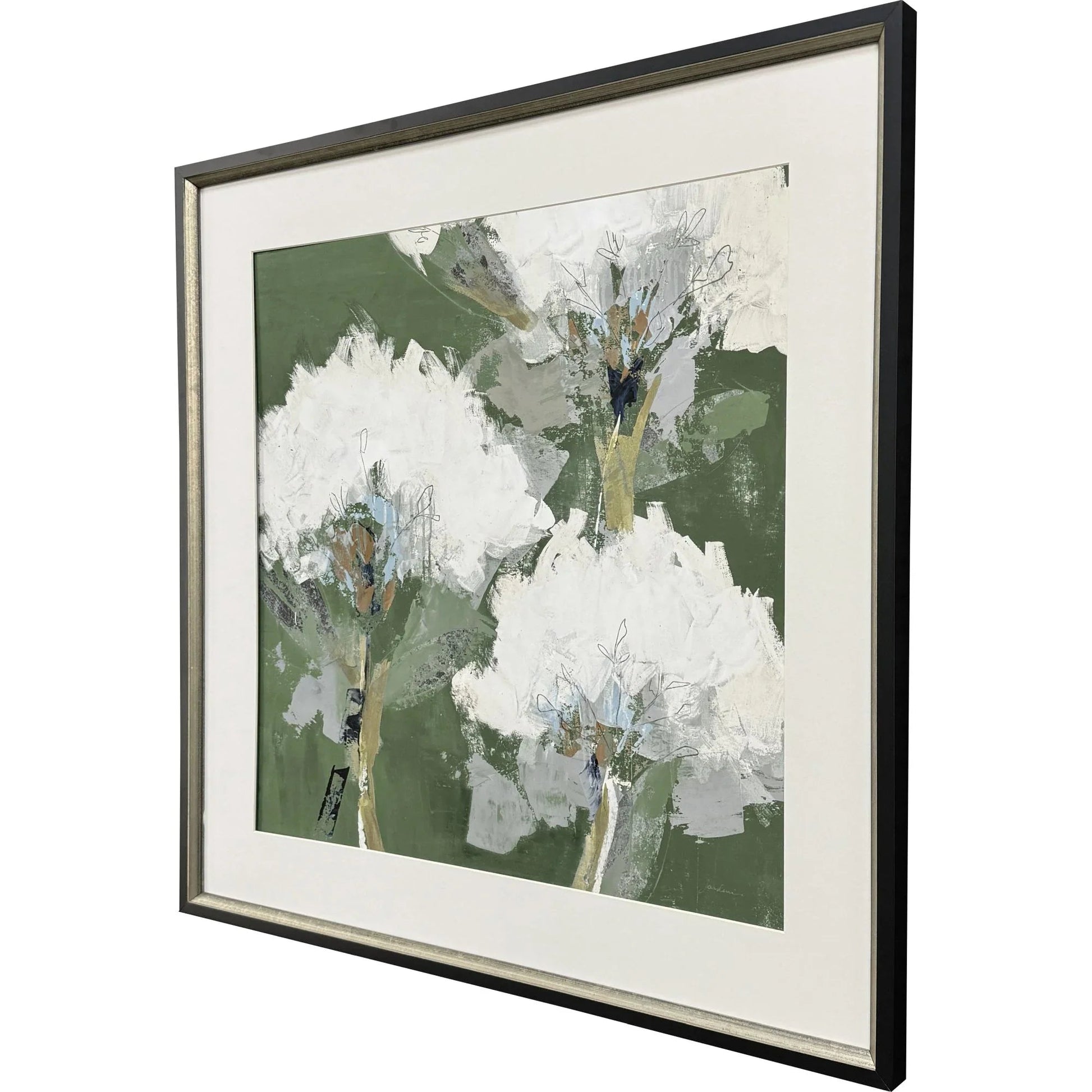 Transform any space with the Starlight II and III Floral Artwork. This piece showcases a stunning array of large white floral blossoms set against a serene green background. Accented by touches of gray, blue, and beige, the artwork brings a sense of tranquility to any room. The floral arrangement is carefully matted in a soothing light buff, enhancing its elegance and charm. The overall presentation is richly complemented by a black painted wood frame with a distressed silver leaf inner slope, adding a touch of sophistication to your decor.