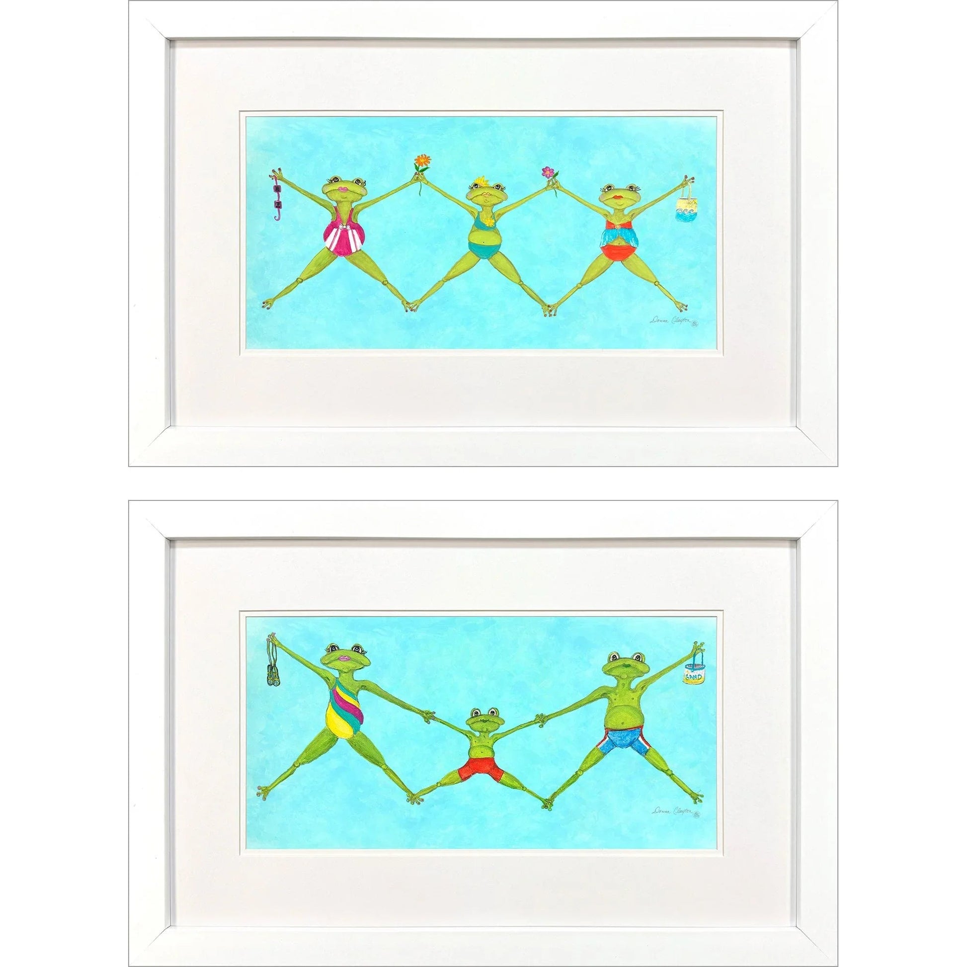 Jump into a world of color and whimsy with the Summer Splash II S/2 Exclusive Hand Assembled Art. This delightful set captures the playful essence of a sunny day by the water. Each piece in the set features charming frog illustrations sporting bright swimsuits against a light blue background. The art is double matted in white and housed in a sleek, block profile matte white frame, making it a perfect fit for any coastal-themed space. The vibrant colors and whimsical design create an uplifting atmosphere, ideal for transforming your home or office into a cheerful retreat.