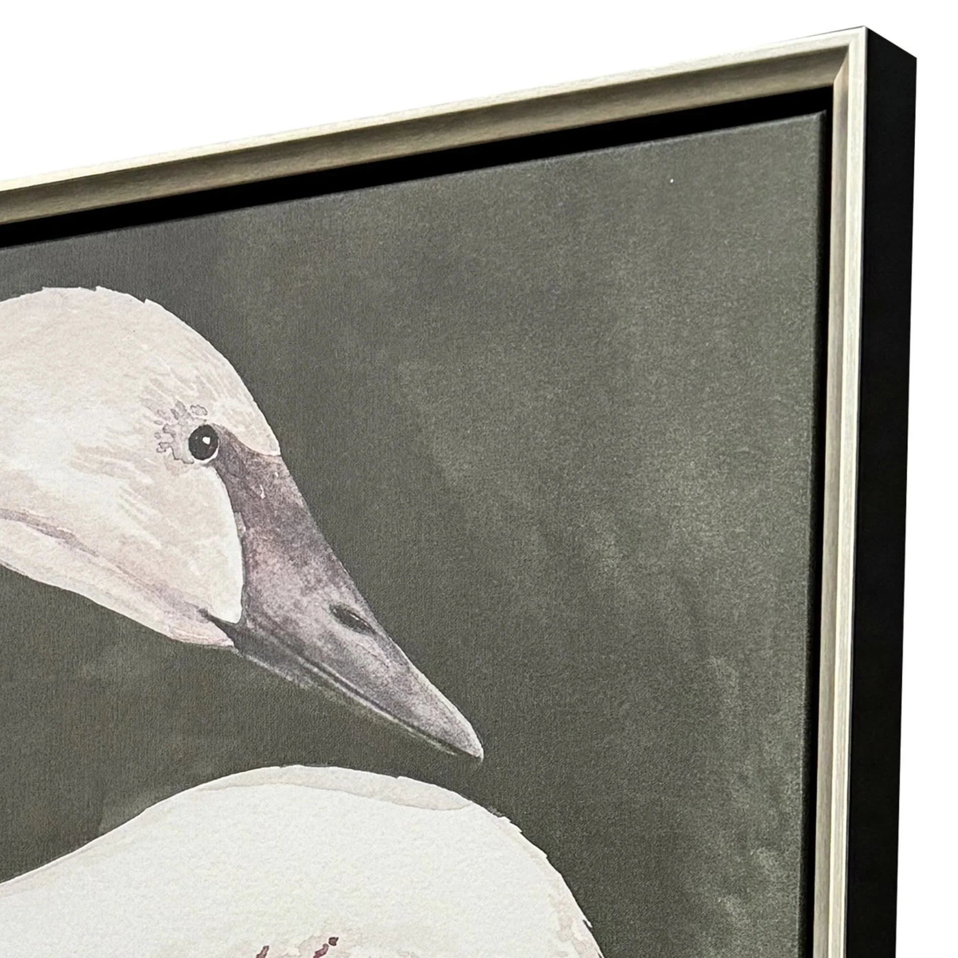 Graceful white swans glide across a dark background, creating a striking contrast that captures the eye. The canvas, titled "Swan Dance I and II," is a beautiful piece of art that adds elegance to any room. The detailed feathers and long necks of the swans are painted with soft pink and white tones, giving the painting a delicate touch. The swans are mounted within a warm silver floater frame with satin black sides, enhancing the depth and elegance of the artwork. This piece is perfect for those looking to add a touch of sophistication and beauty to their home or office decor.