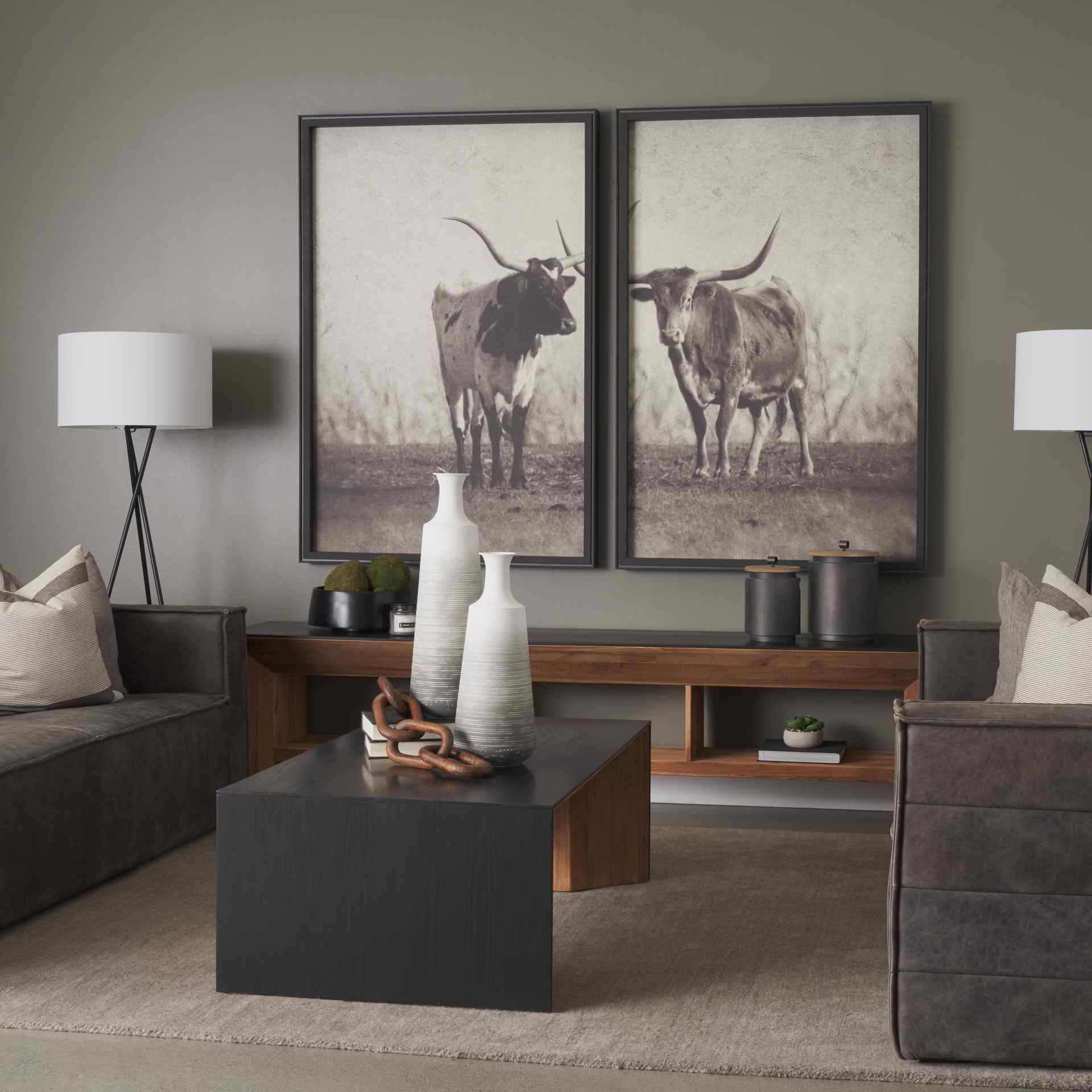 - The rusticity of the wood is juxtaposed by a sleek, smooth, modern black waterfall frame.