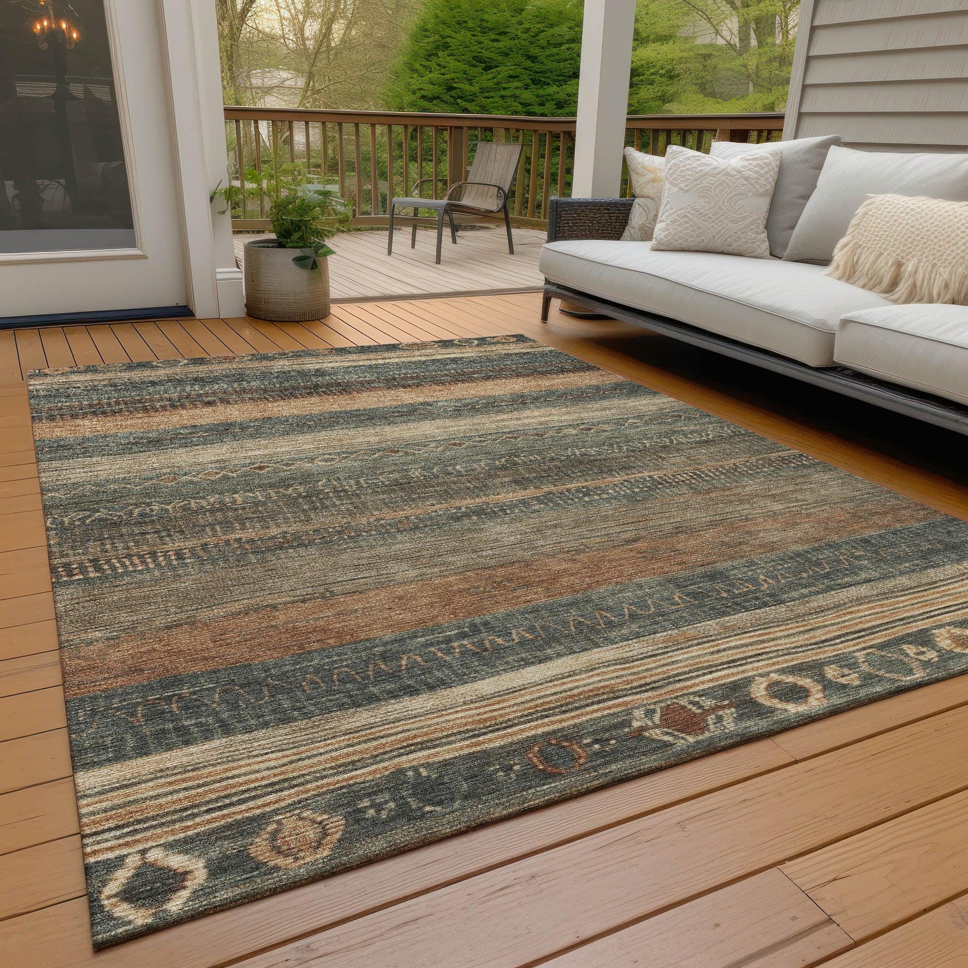 Transform your living spaces with this vibrant, green rug that seamlessly blends style and practicality. Featuring horizontal Aztec motifs, it adds a touch of earthy charm to any environment. Its UV stabilized fabric makes it perfect for both indoor and outdoor settings, offering versatility and durability. The rug is designed to withstand the elements, maintaining its vibrant color even in areas with lower hours of direct sunlight. This makes it ideal for covered outdoor spaces or lightly sunlit areas.
