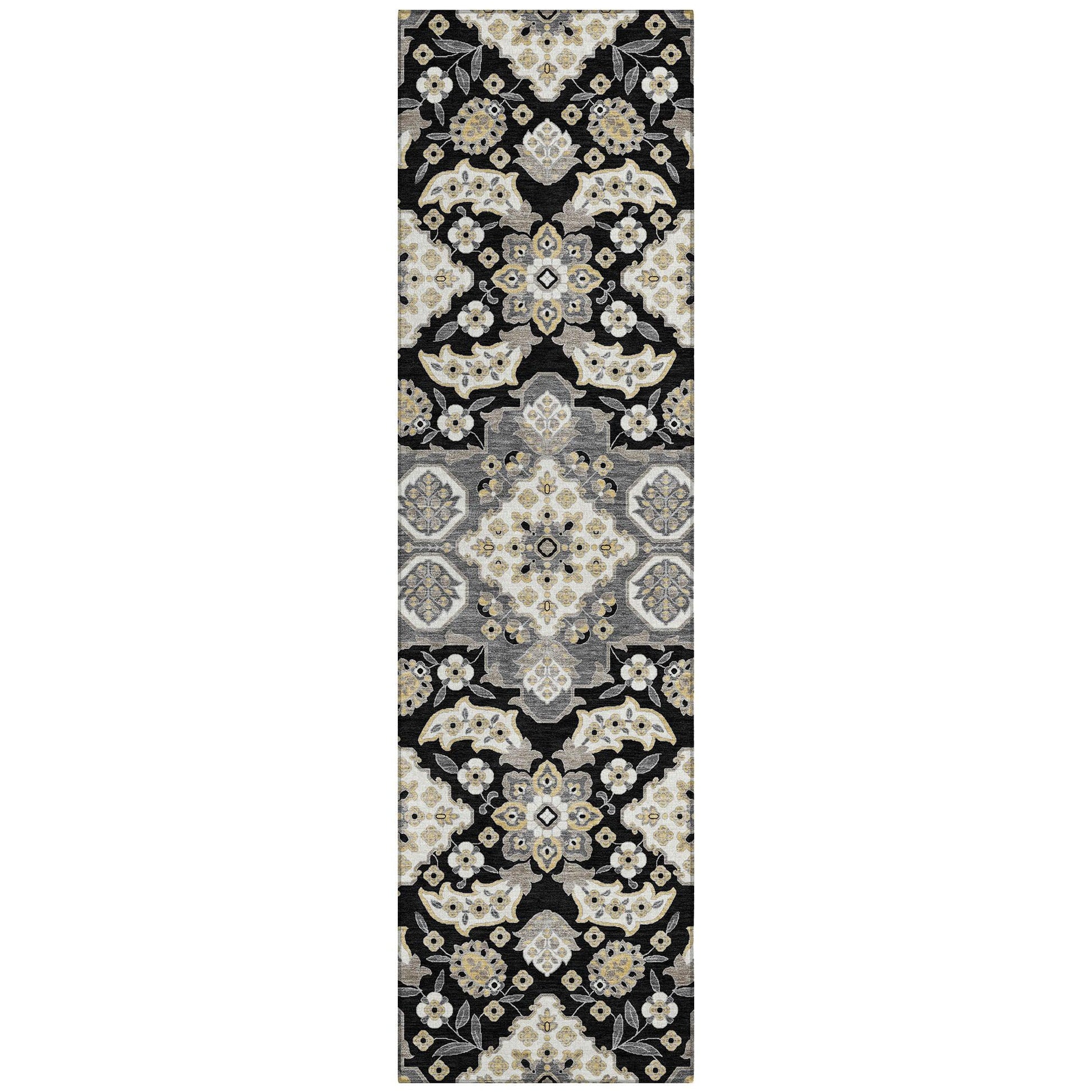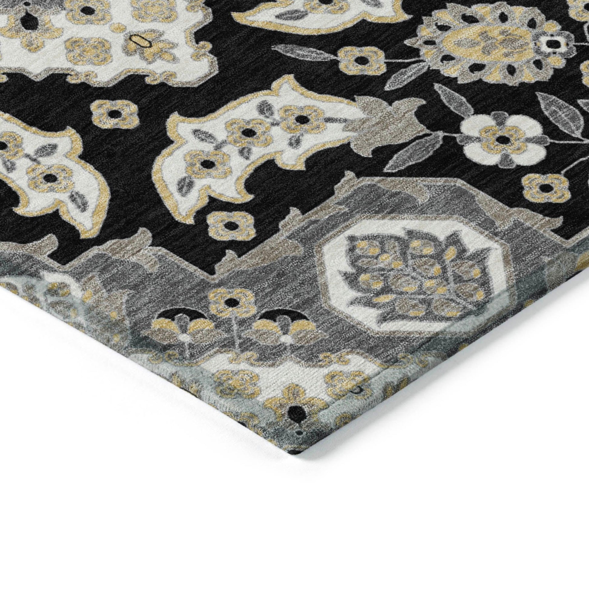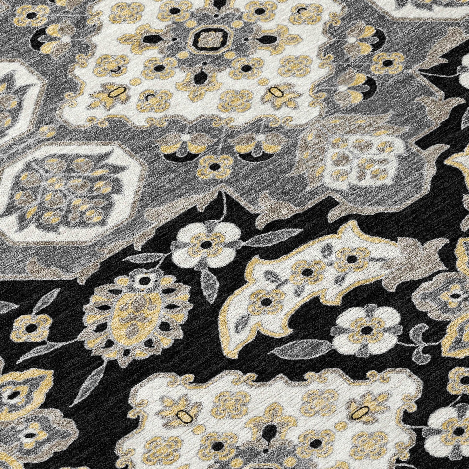 The Taelira Black Washable Rug offers a modern twist on the classic large panel Kerman style, featuring a globally inspired pattern that complements any setting. Designed for both indoor and outdoor environments, this rug is UV stabilized to ensure long-lasting durability. Its ultra-thin profile makes it easy to clean and maintain, while the integrated non-skid backing provides stability, eliminating the need for an extra rug pad. Ideal for busy households with kids and pets, this rug is both practical and stylish.