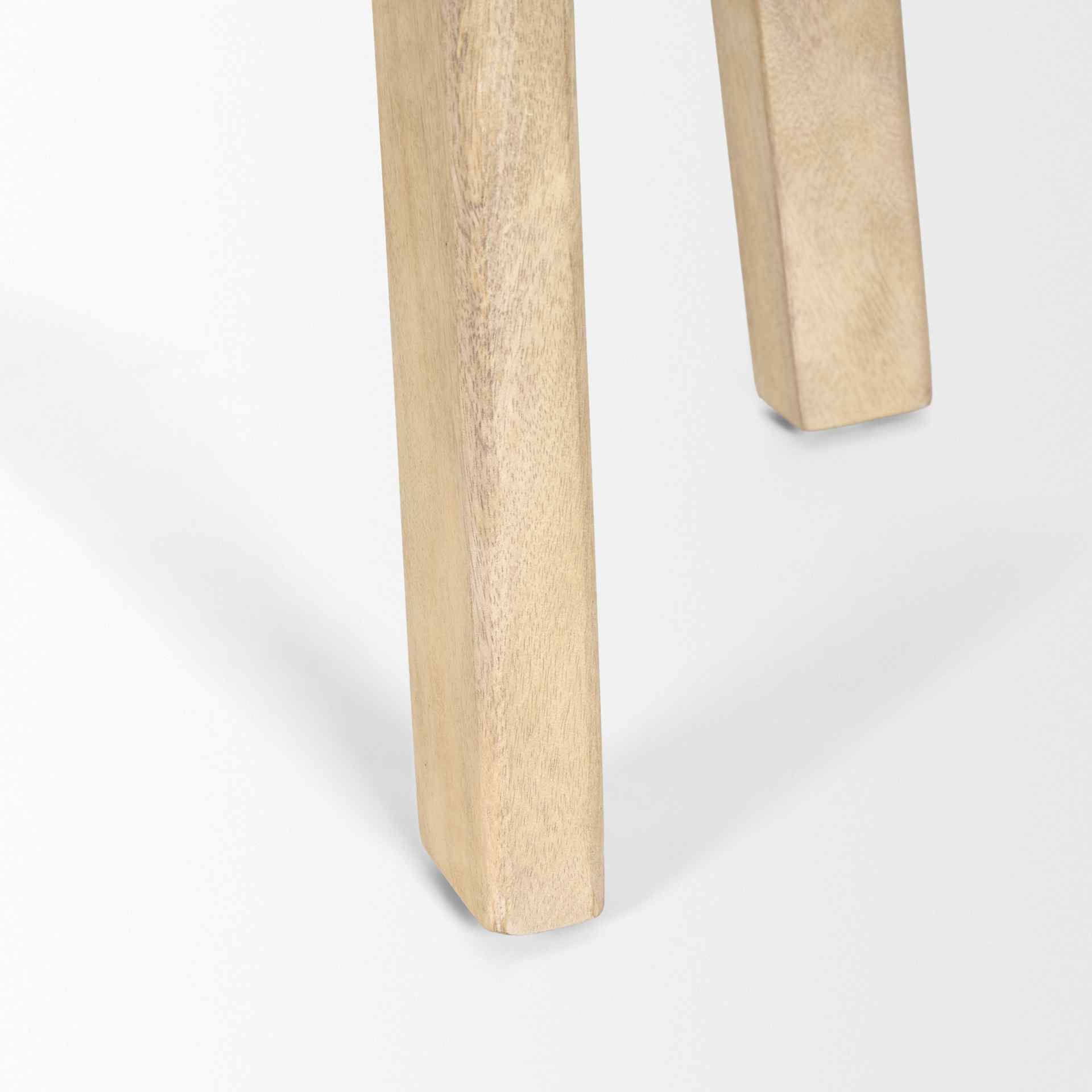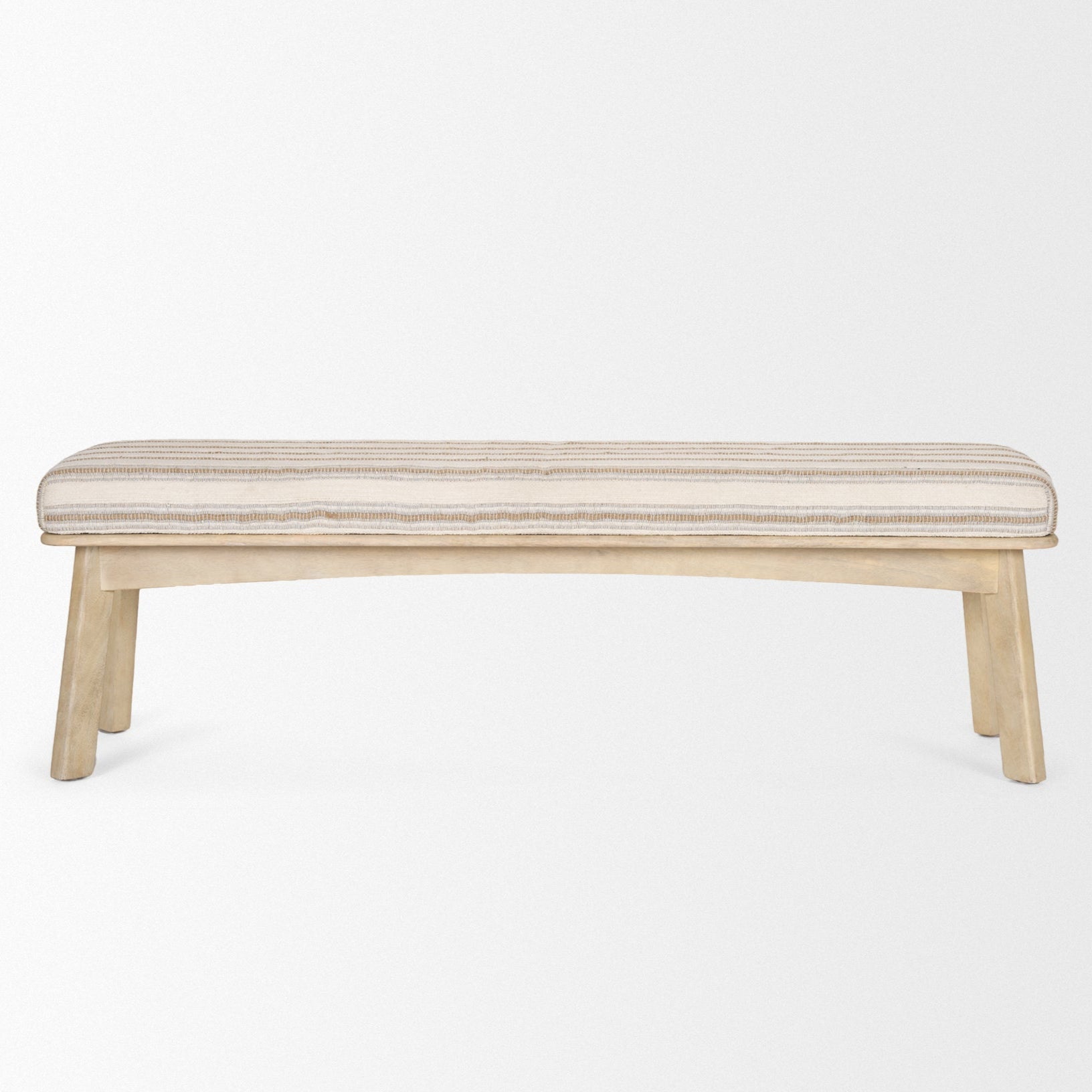 The Taimo White Washed Fabric Bench With Rustic Charm brings a touch of elegance and comfort to any room. It is crafted from solid mango wood and features a heavy white-wash finish, which highlights its warm undertones. The cushioned seat is upholstered with a blend of cream cotton, jute, and beige chenille, offering a subtle horizontal striped pattern that runs across the seat. This combination of materials and design gives the bench its rustic charm, while also ensuring that it easily complements various interior styles.