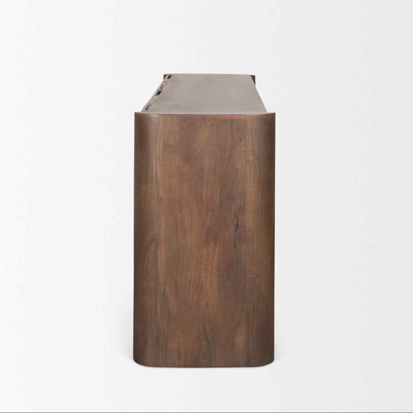 The Tammar Four Doors Wood Sideboard brings a blend of style and practicality to any living space. Crafted from smooth mango wood, it features a rich medium brown finish that complements its sleek rectangular design. The sideboard's four-panel doors are equipped with concealed handles, providing a seamless look that enhances the minimalist aesthetic. Inside, you'll find three removable shelves, allowing for customizable storage solutions. Whether organizing dinnerware, linens, or multimedia devices, this sideboard meets diverse storage needs.