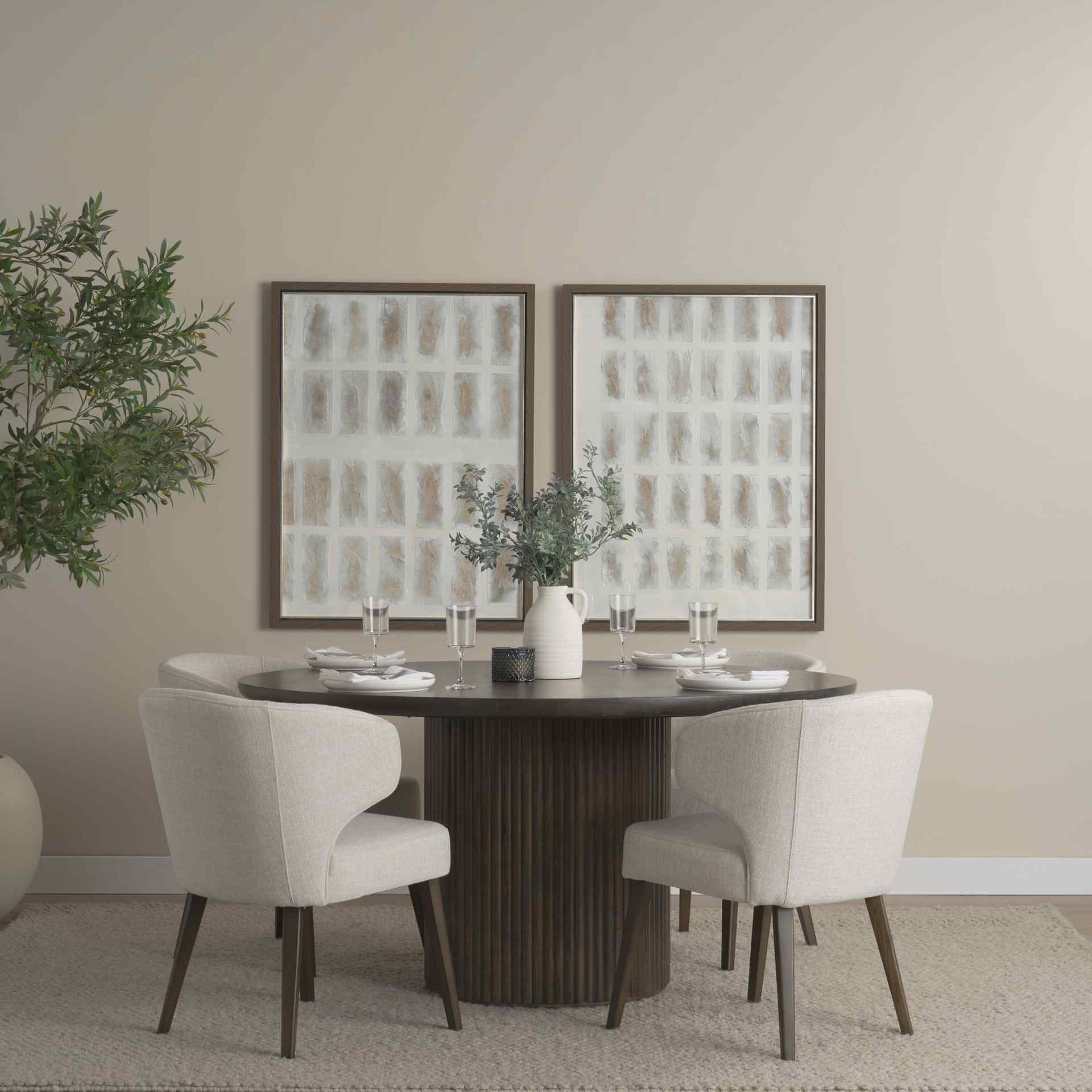 The Terra Fluted Dining Table with 4 Niles Chairs Set brings a bold, sculptural style to your dining space. It features a striking fluted pedestal table paired with four generously cushioned, armless wingback chairs, offering a complete dining upgrade. The set blends standout design with wraparound comfort, making every meal feel special. Crafted from wood and fabric, its brown and white color scheme adds a touch of timeless elegance to any home. The ensemble’s seamless design makes it a perfect centerpiece for both everyday meals and special gatherings, creating a welcoming atmosphere for family and friends.