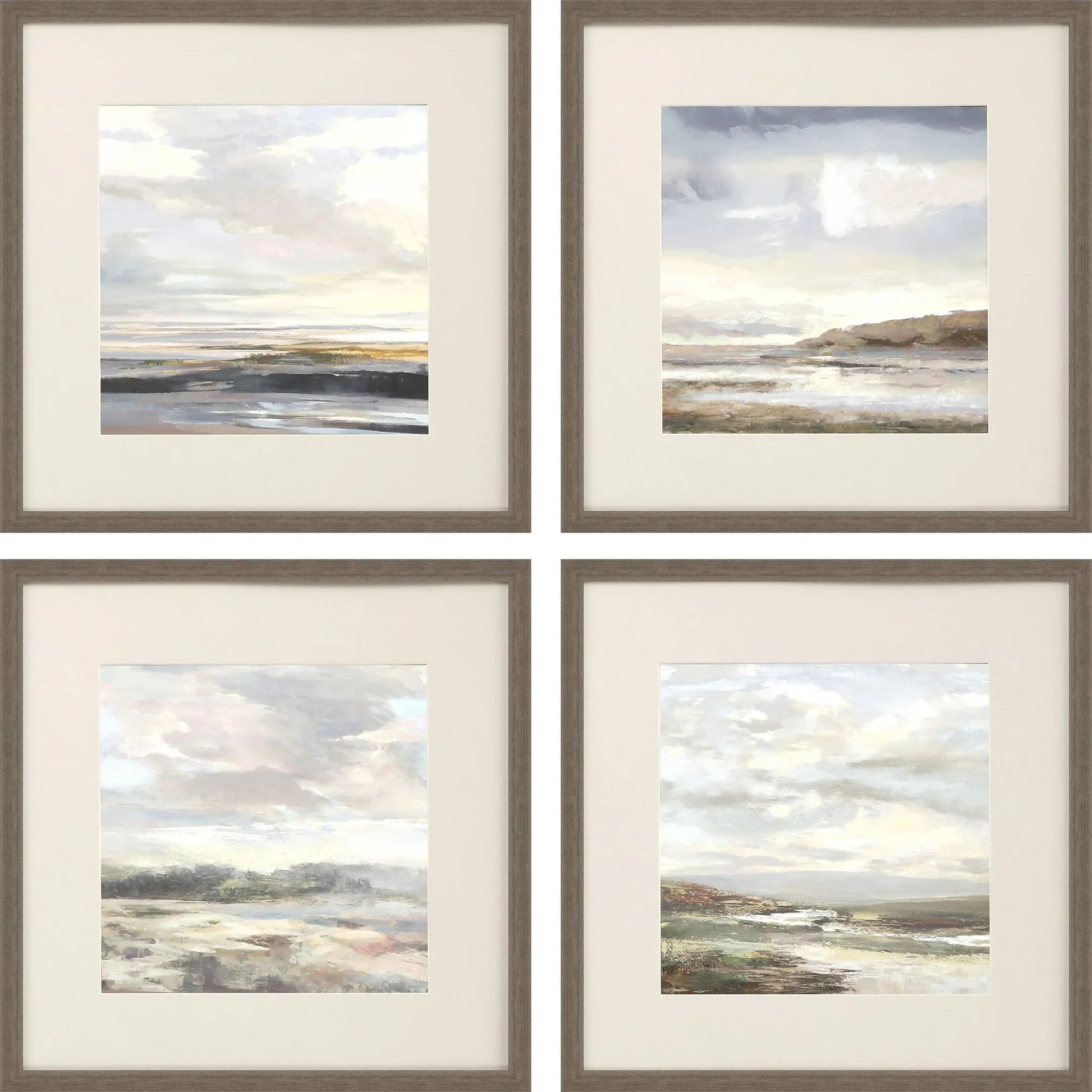 Enhance your living space with a touch of tranquility with this set of four framed landscapes. Each piece captures a different vista, providing a serene escape into a world of soothing coastal and sky themes. The landscapes are elegantly matted in putty tones that seamlessly blend with the soft pastel colors of beige, light blue, gray, and cream. This combination creates a calming atmosphere ideal for any room seeking a touch of nature's beauty.