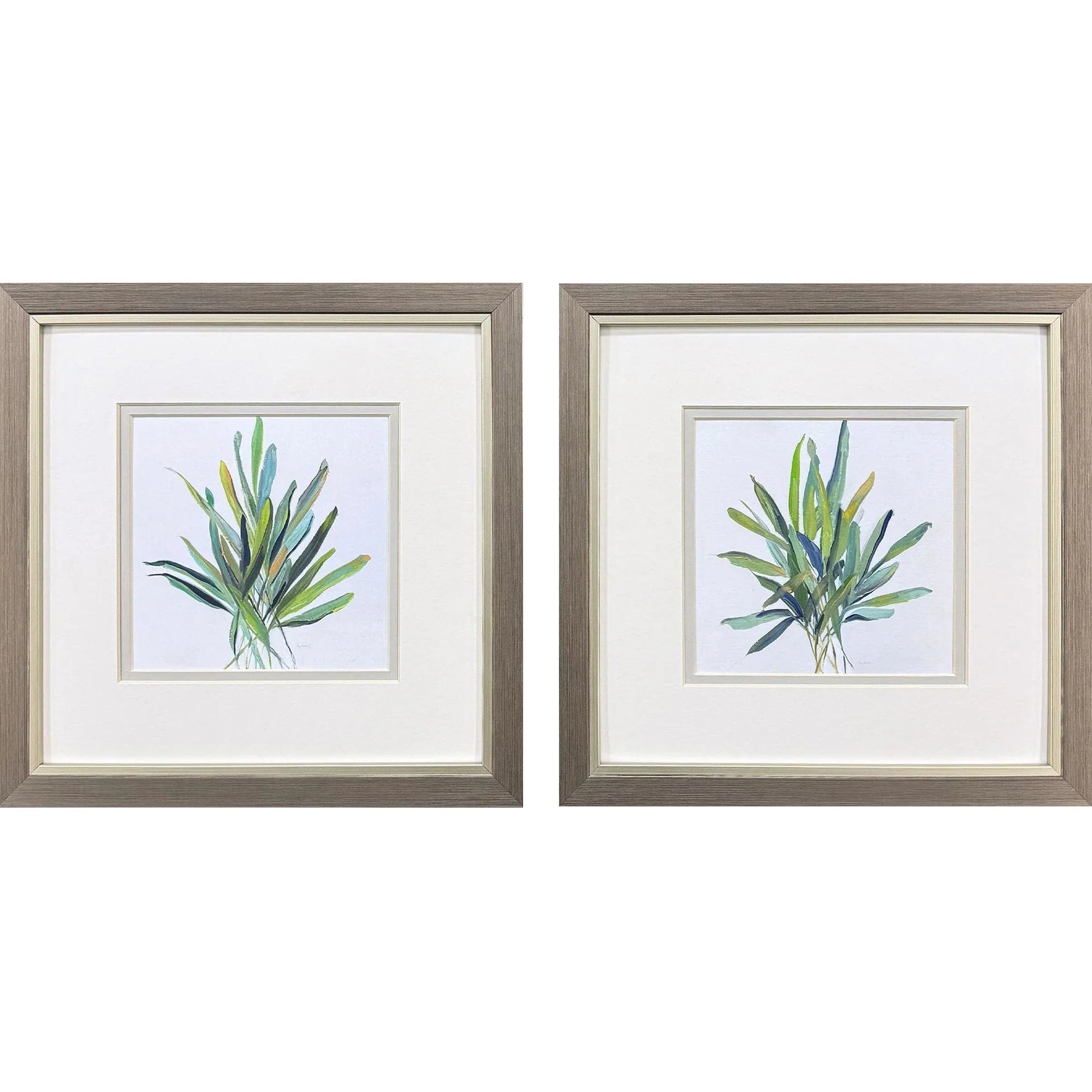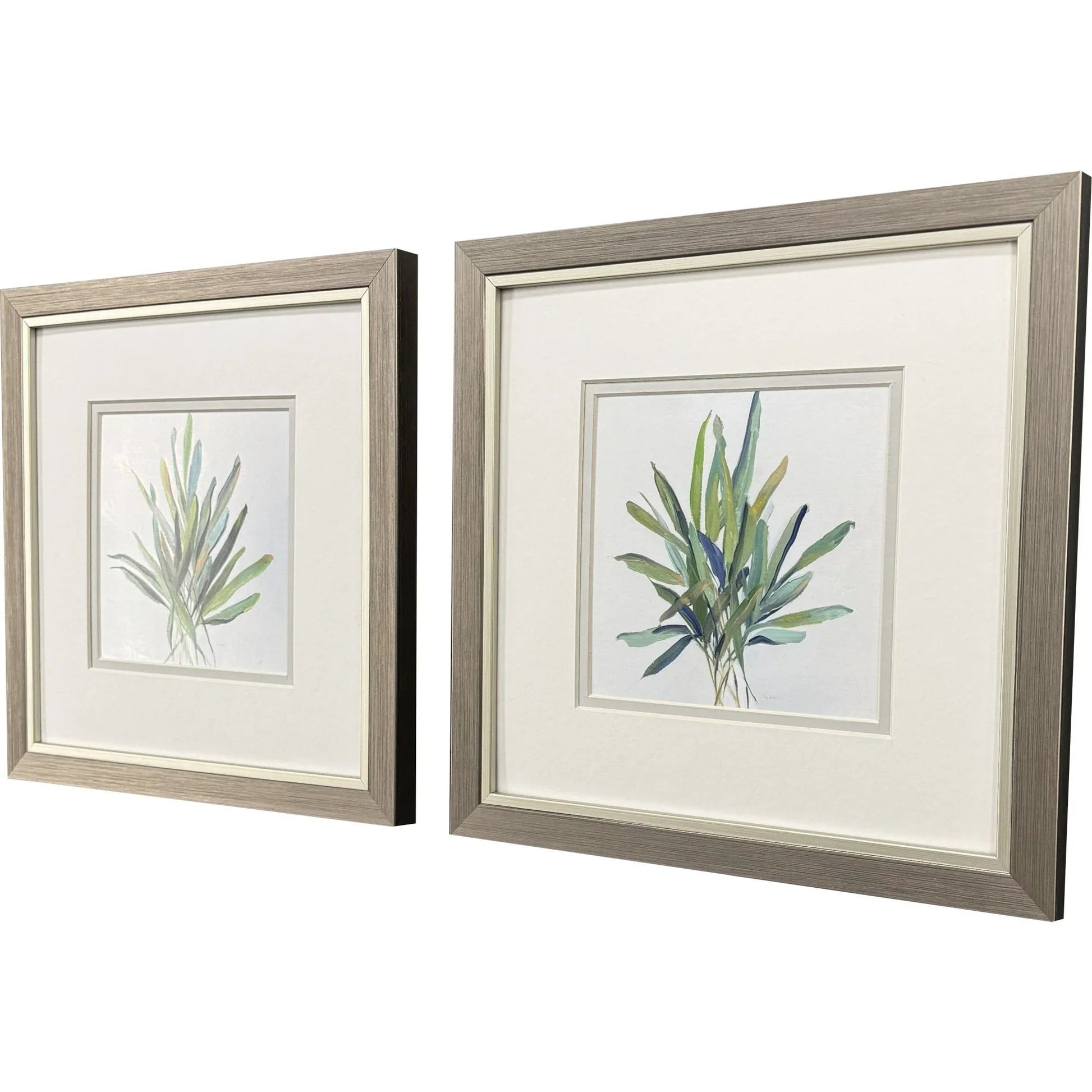 Add a touch of nature to your home with this elegantly designed set of Framed Wall Art. The Tropical Leaves S/2 Coastal Matted Framed Wall Art Set features green plant illustrations with subtle blue and yellow accents, creating a soothing visual appeal. Each piece is double matted with a crisp white top mat, enhancing the artwork's vibrant colors and providing a clean, polished look. The frames are crafted with a brushed pewter finish, complete with a silver lip, offering a sophisticated touch to any room.