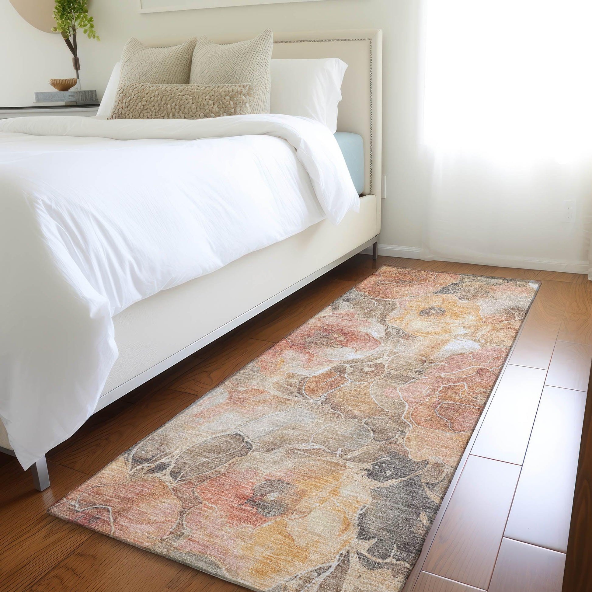 Refreshing your home decor is easy with this stylish floral rug. Its abstract rose patterns and shadow effects add a touch of elegance to any space. The rug's peach color fits seamlessly into a wide range of settings, making it a versatile choice for both indoor and outdoor areas. Made from durable polyester, this rug is designed to withstand the rigors of family life and pet activity. With its UV stabilization, it remains vibrant even when exposed to sunlight, though it's best suited for areas with less direct sun exposure. The non-skid backing ensures safety and convenience, eliminating the need for an extra rug pad and helping you save on costs.