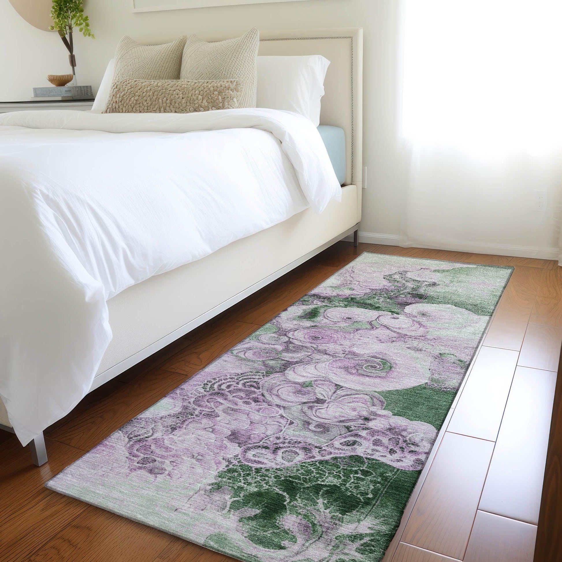 Transform any space with the Uraion Green Washable Rug With Non-Skid Backing. Designed with abstract seashell-like patterns, this rug adds a unique charm to your home or outdoor area. Its versatile use for both indoor and outdoor settings makes it a perfect fit for any decor style. Not only is it visually appealing, but it also features UV stabilization to maintain its vibrant green color even when exposed to sunlight, making it a reliable choice for various environments.