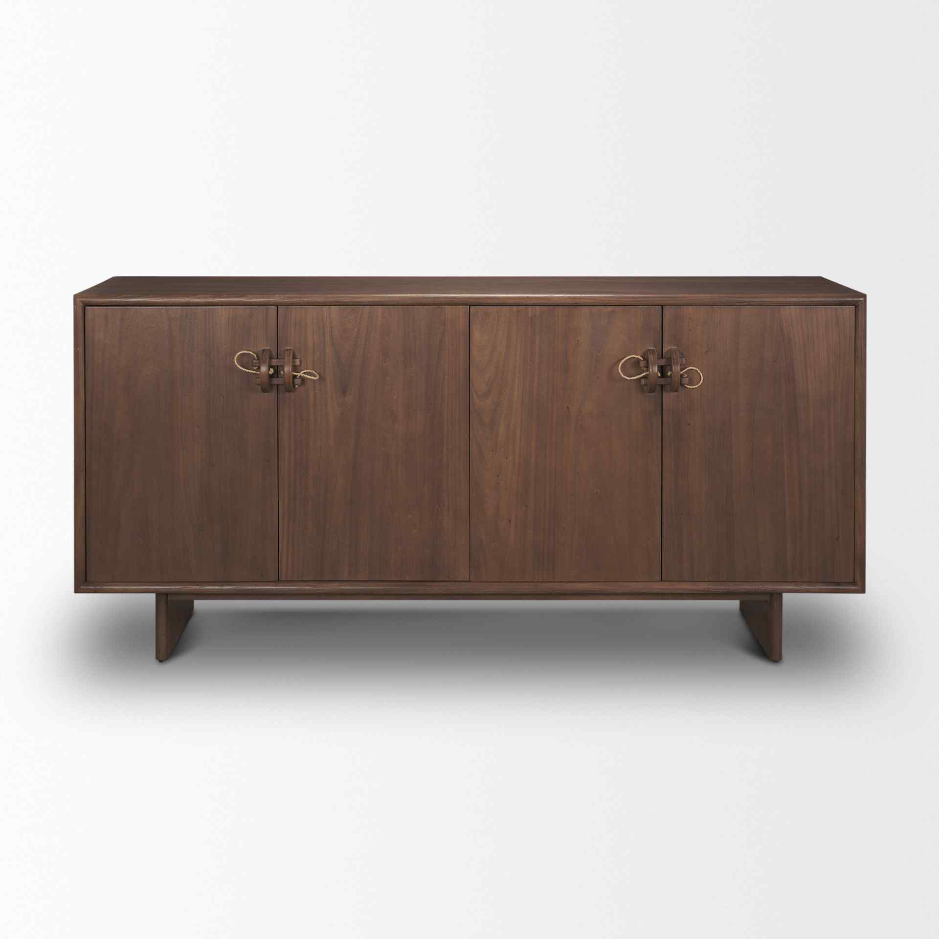 The Varenna Sideboard is crafted with precision from rich, dark brown solid elm wood, enhanced with engineered wood and a graceful elm veneer finish. Its sophisticated design features a rounded-edge frame that elegantly encloses four cabinet doors. The doors are adorned with captivating half-circle rope handles, secured with charming wooden pins, adding a touch of character to its minimalist appeal. This sideboard brings a touch of old-world charm to any space, making it a timeless piece that complements various decor styles.