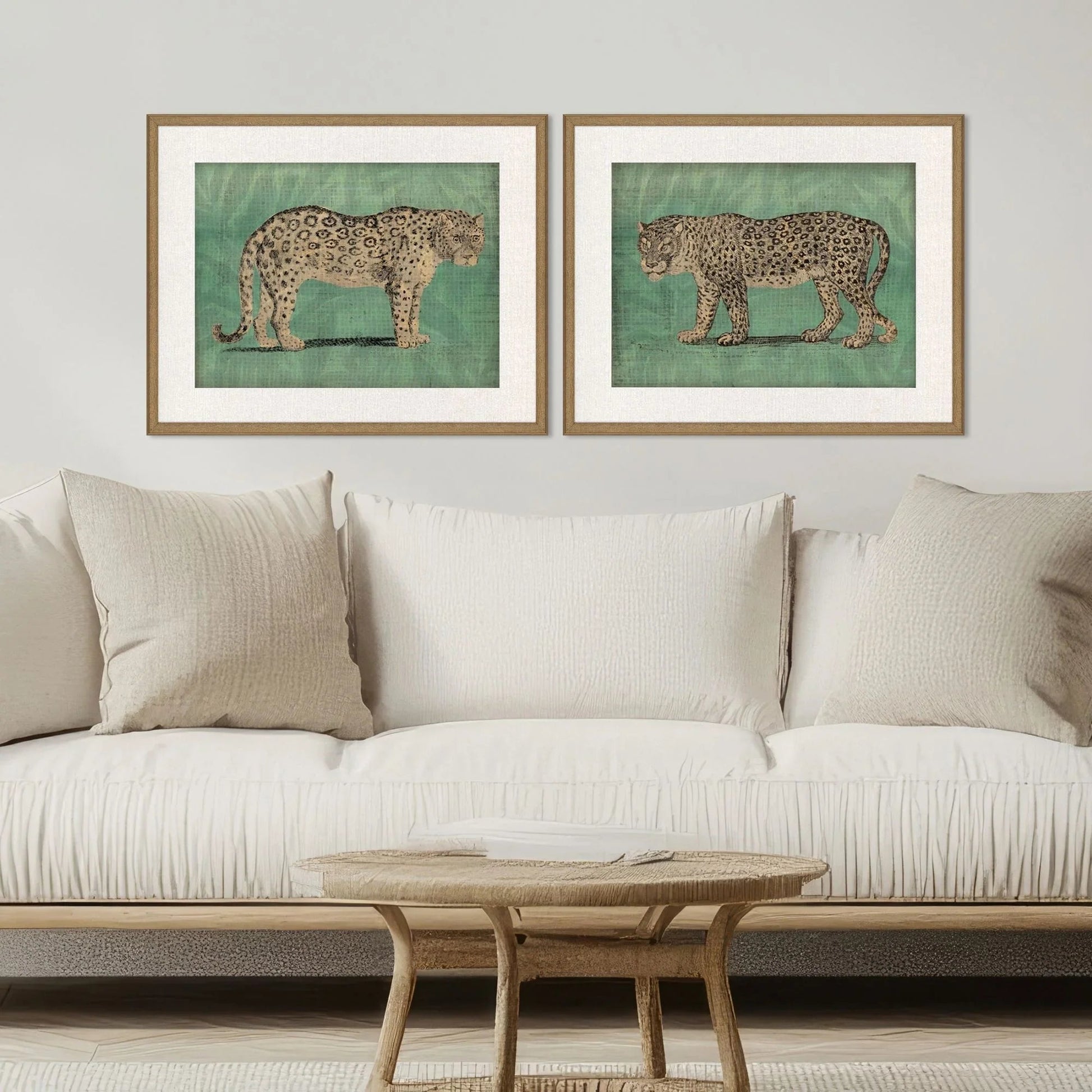 Each piece is crafted using high-quality materials, including paper, cardboard, wood, and glass. The premium matting enhances the artwork, ensuring that the leopards' beige and black-spotted coats pop against the green background. These framed prints are more than just wall decor; they are a testament to skilled hand assembly and meticulous attention to detail. The glass front protects the artwork, ensuring longevity and preserving its vibrant colors.