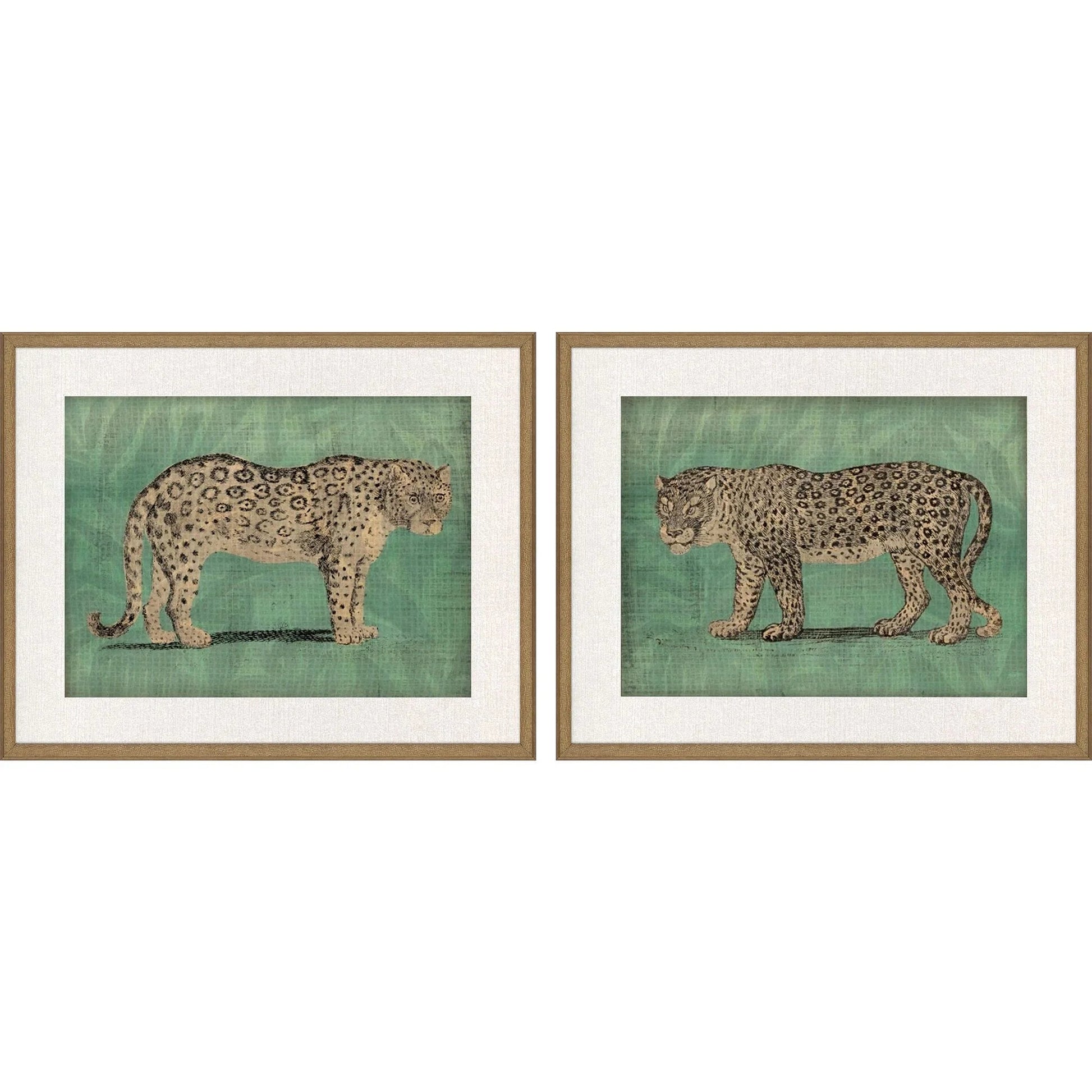Bring a touch of the wild into your space with this elegant set of two Framed Wall Art prints depicting majestic jungle cats. These leopards, set against a modern green backdrop, add a contemporary twist to any room. The combination of the striking imagery and the rich, antique gold wood frame makes these art pieces a standout addition to your home decor. The embossed weave pattern on the frames gives them a sophisticated look, perfect for those who appreciate transitional style.
