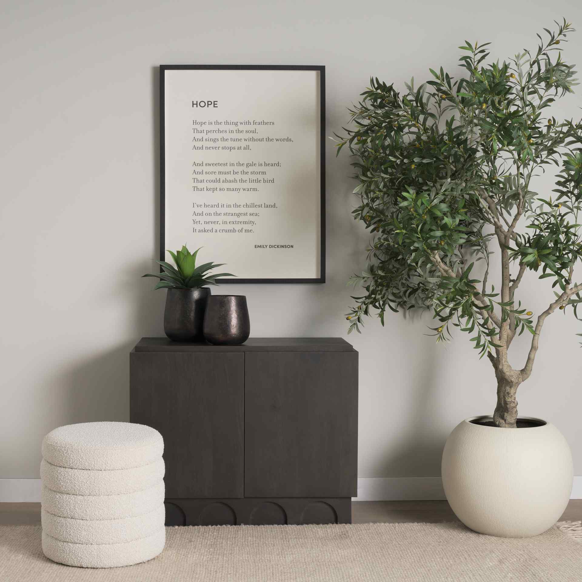 The wooden accent cabinet, crafted from solid mango wood, brings a unique touch to any room with its deep, dark brown finish. Its design features elegant scalloped arched cutouts on the recessed base, with matching arched detailing on the cabinet doors. These thoughtful details not only add a sophisticated look but also serve as concealed pulls, making the piece both functional and stylish. The Wagner cabinet is perfect for those seeking to add a touch of elegance and practicality to their space.