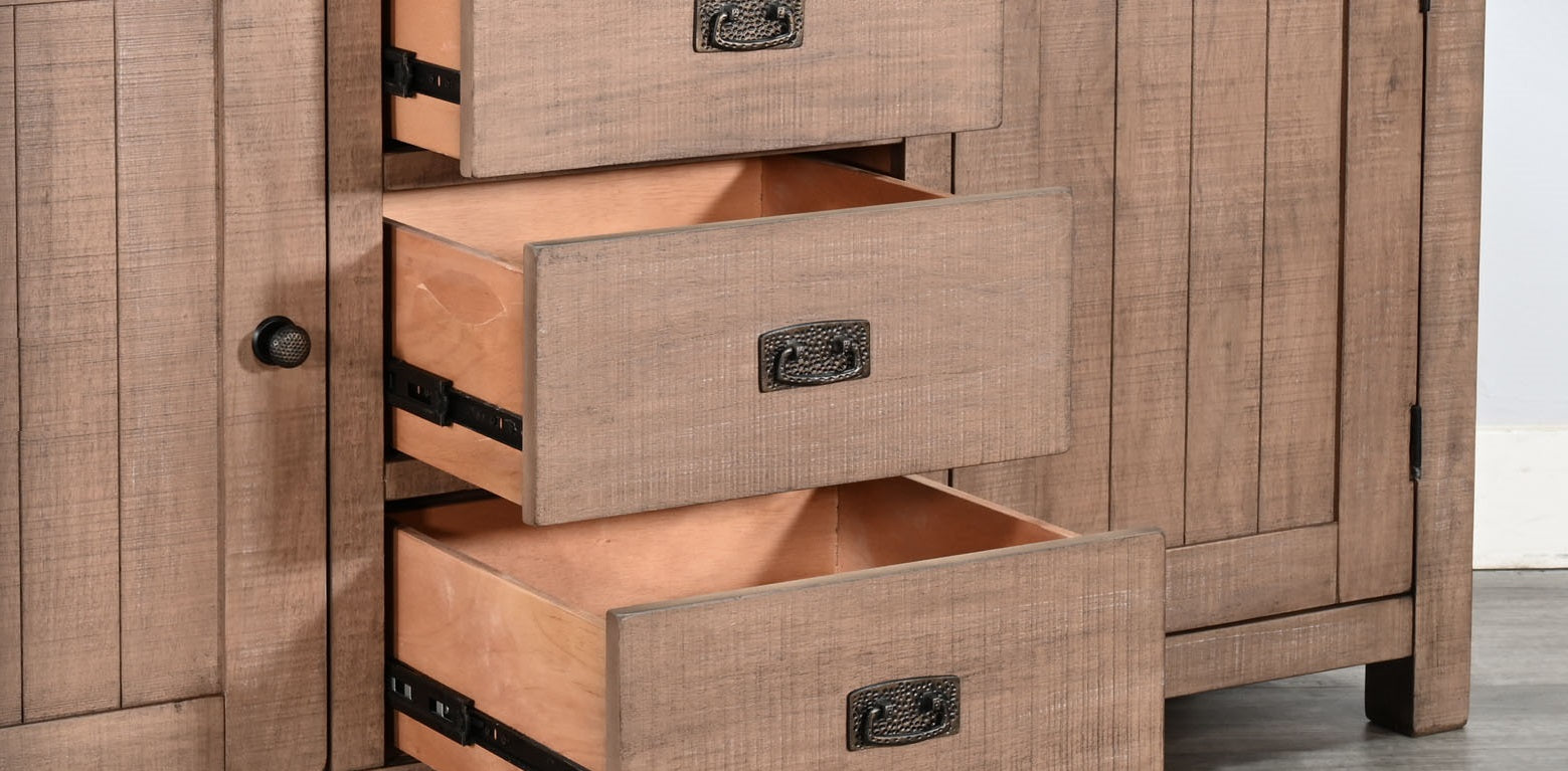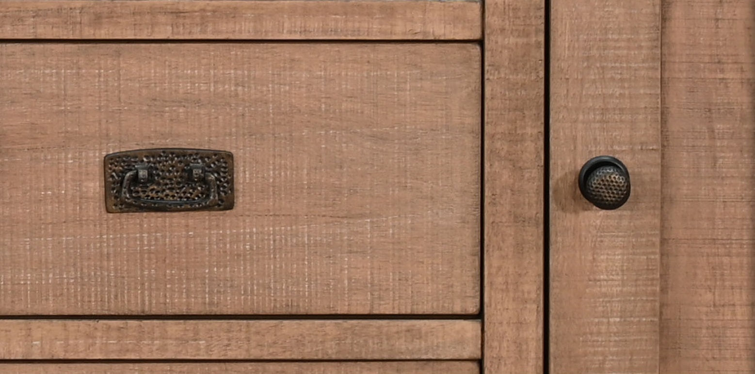 This mahogany sideboard offers plenty of space for both storage and display in any room. Made from solid mahogany wood, it boasts a smooth, weathered finish that complements its timeless design. The sideboard includes two wood cabinets, perfect for storing dinnerware and wine bottles thanks to its dedicated wine storage. With three drawers, it provides ample room for small items and utensils. Its natural color fits well with various decor styles, making it a versatile addition to your home. No assembly is required, allowing you to enjoy this piece right away.